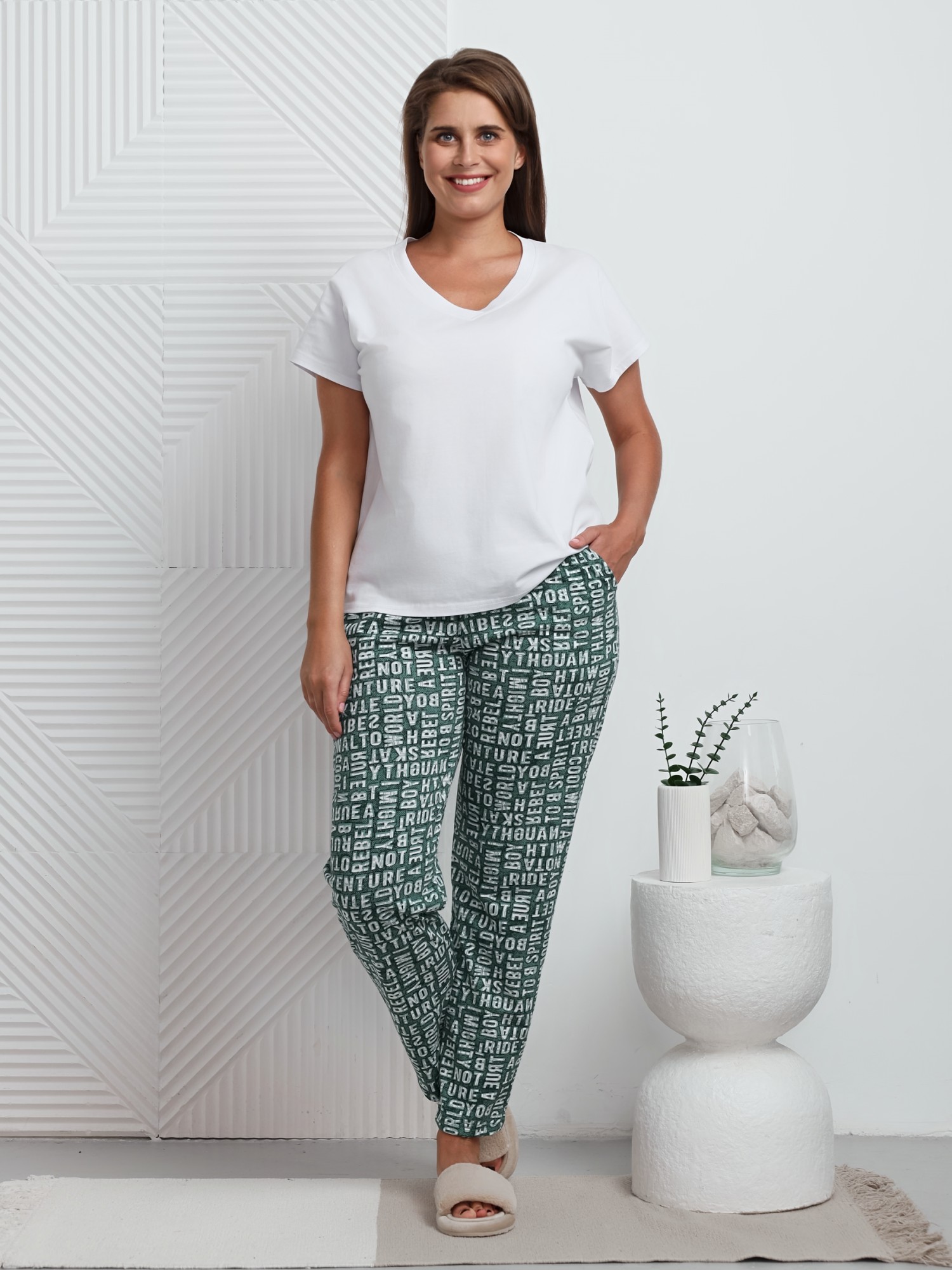 Брюки женские из трикотажного полотна «кулирка» с набивным рисунком, классического кроя, длинные, с карманами в боковых швах, на притачном поясе с эластичной тесьмой внутри.