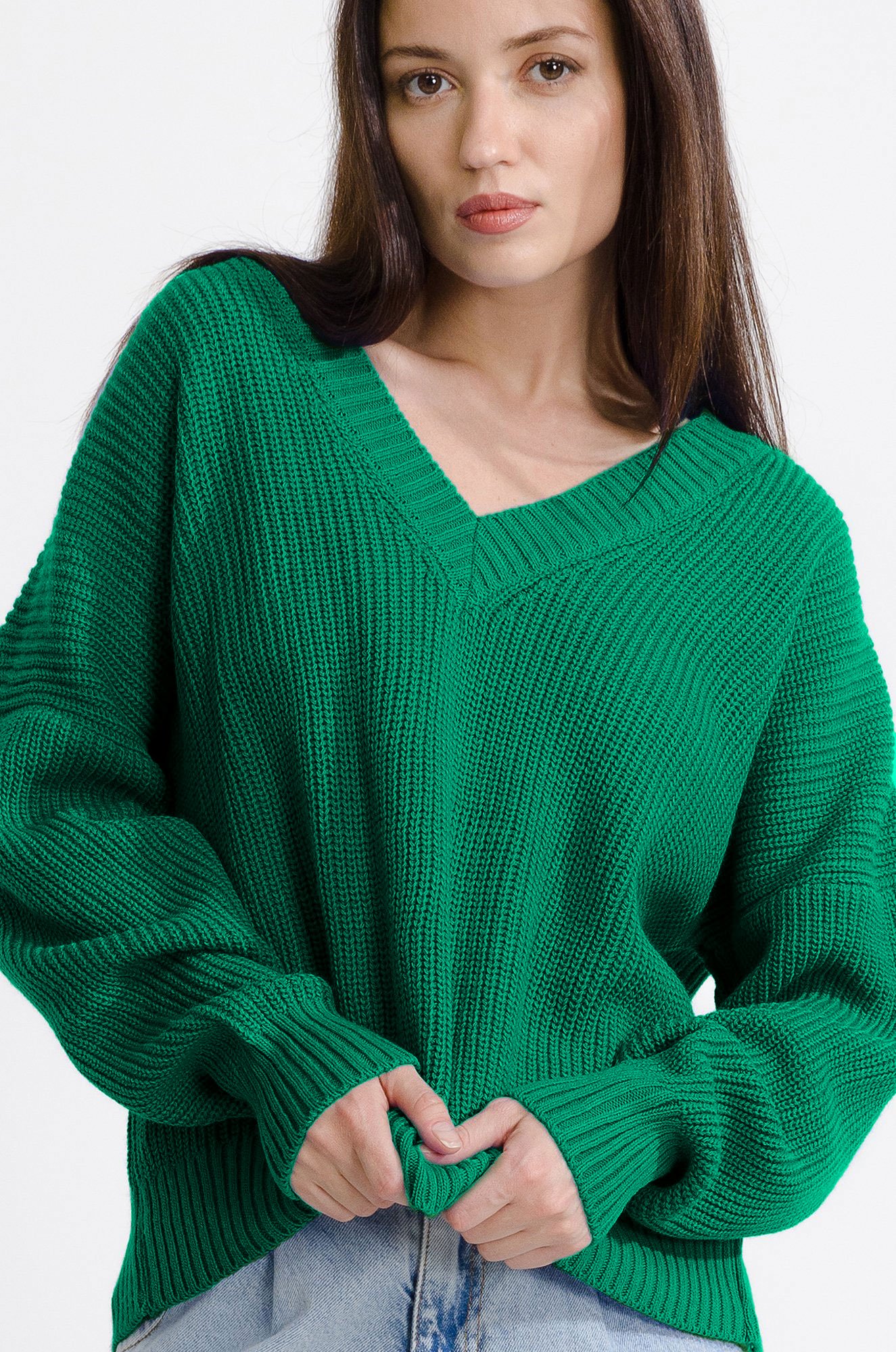 Окутыв..показатьающий нежностью и заботой женский джемпер оверсайз выполнен из вязаного трикотажа. Волнующий V-образный вырез изящно открывает зону декольте и делает образ интригующим. Объемный зеленый свитер для женщин станет идеальной основой для уютных многослойных образов в зимние и осенние дни!