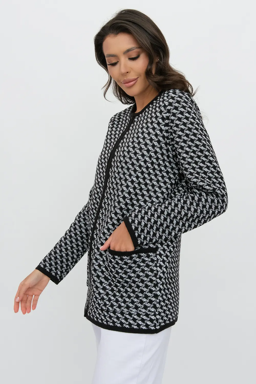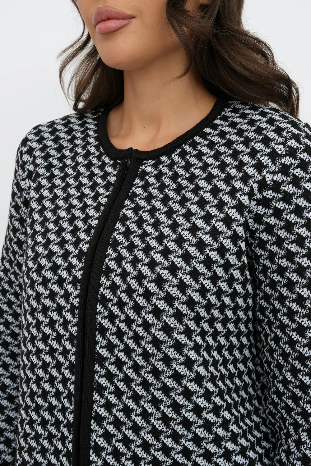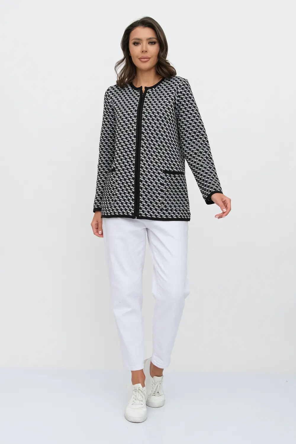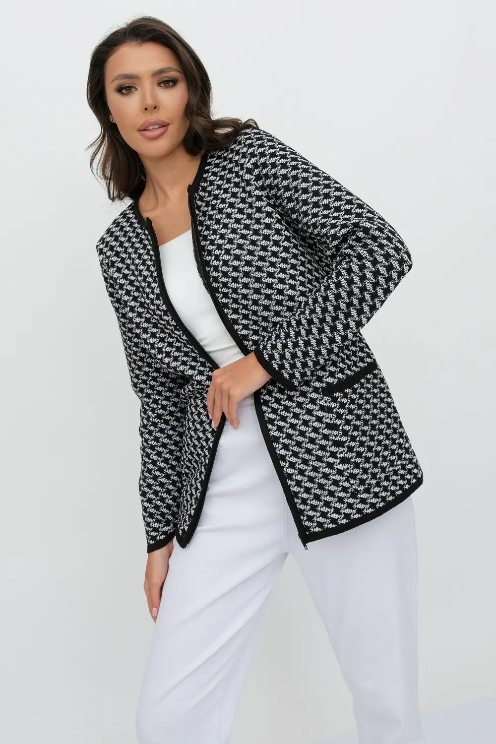 Женский вязаный жакет полуприлегающего силуэта. По переду застегивается на молнию, вырез горловины круглый. Рукава втачные длинные. Два накладных кармана квадратной формы. Жакет выполнен жаккардовым переплетение образуя неброский рисунок. черный