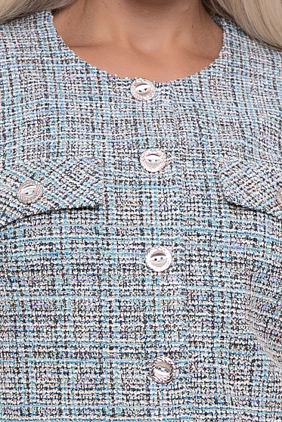 Жакет в стиле шанель из трикотажного полотна твид свободного силуэта с центральной застежкой на петли и пуговицы.