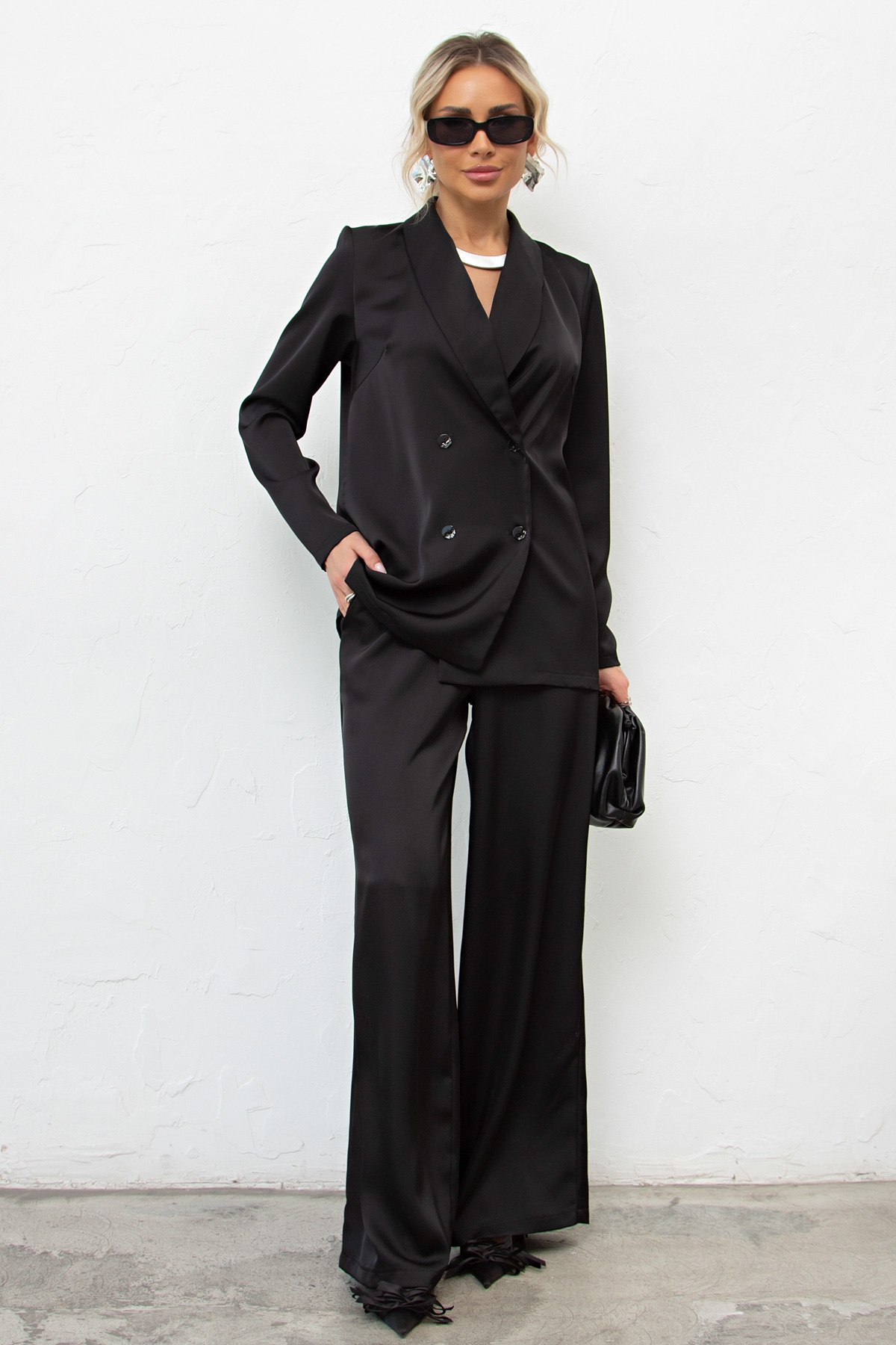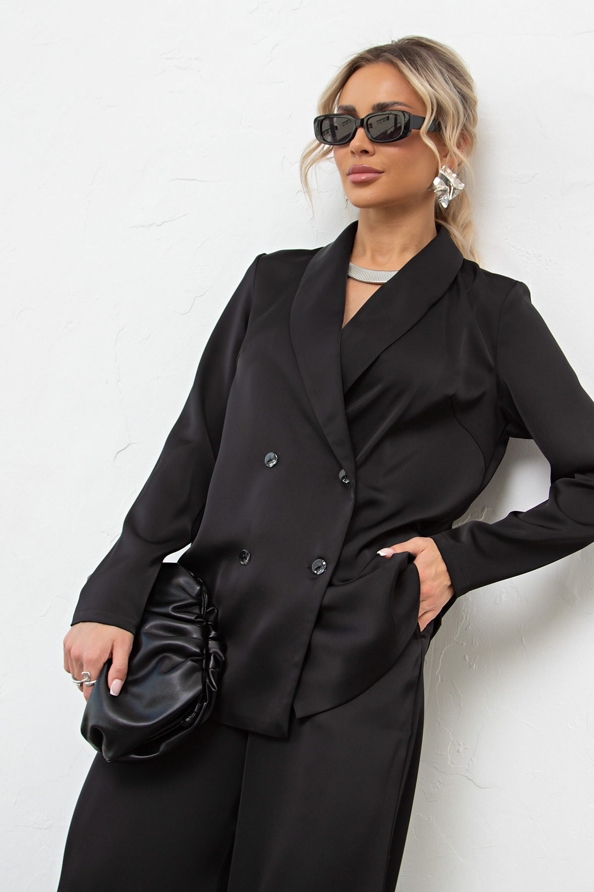 Классический двубортный  жакет с шалевым воротником выполнен из атласной ткани.