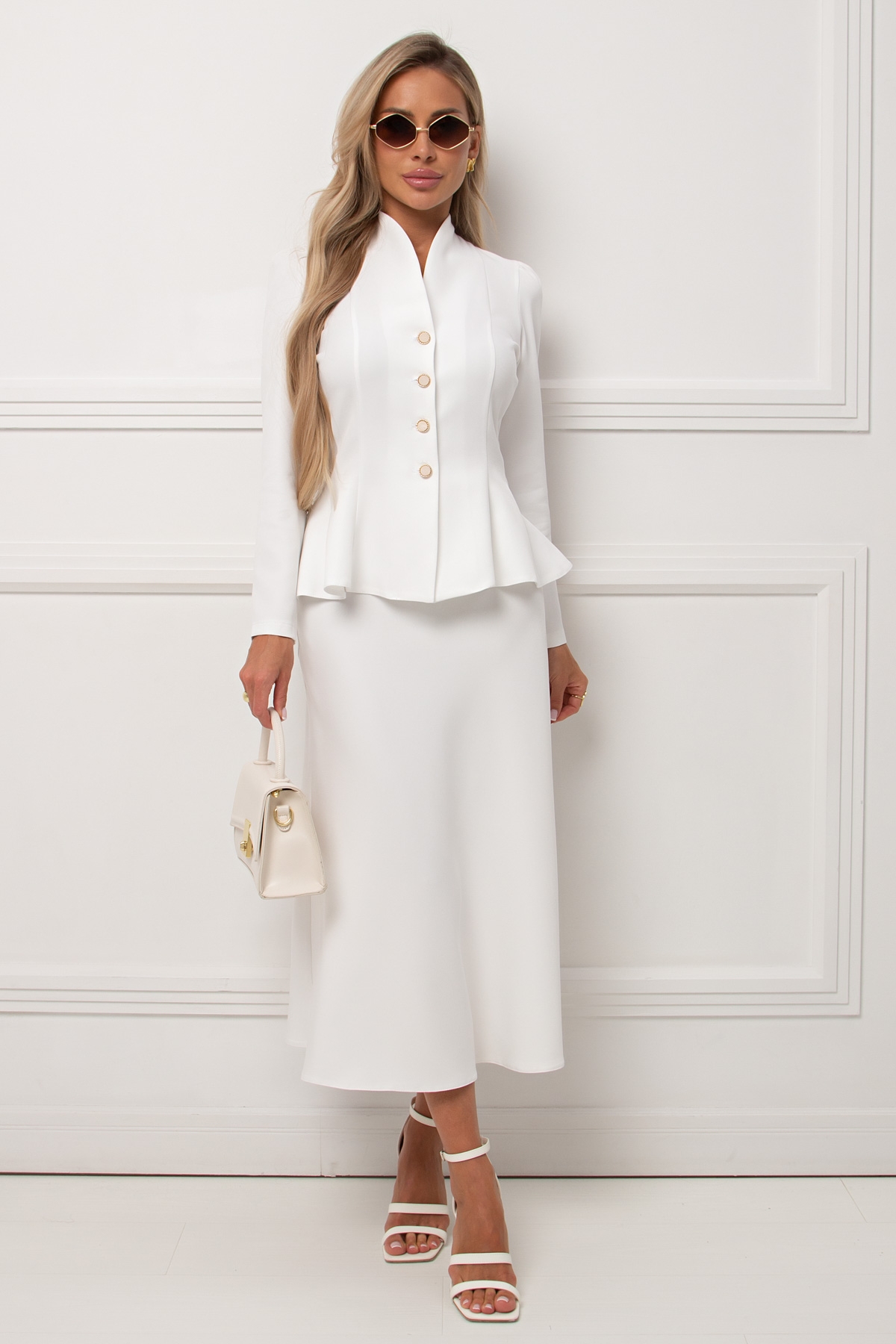 Стильный, элегантный приталенный жакет с баской, выполнен из плательно-костюмной  ткани. Длинный втачной рукав. Цельнокроеная  стойка переходит в планку с застежкой на петли и пуговицы.