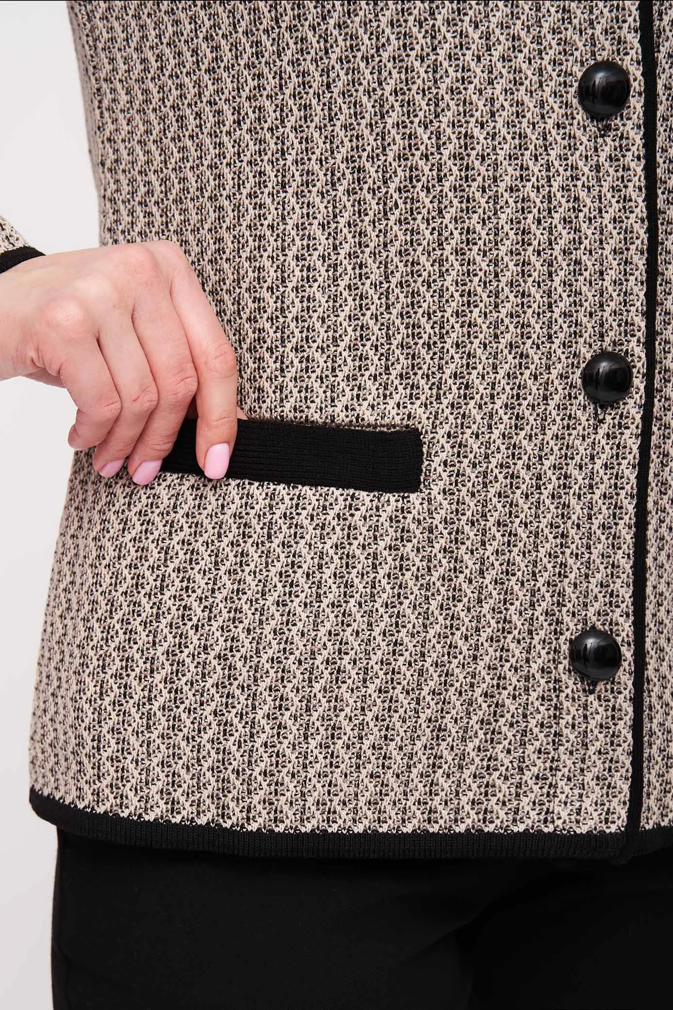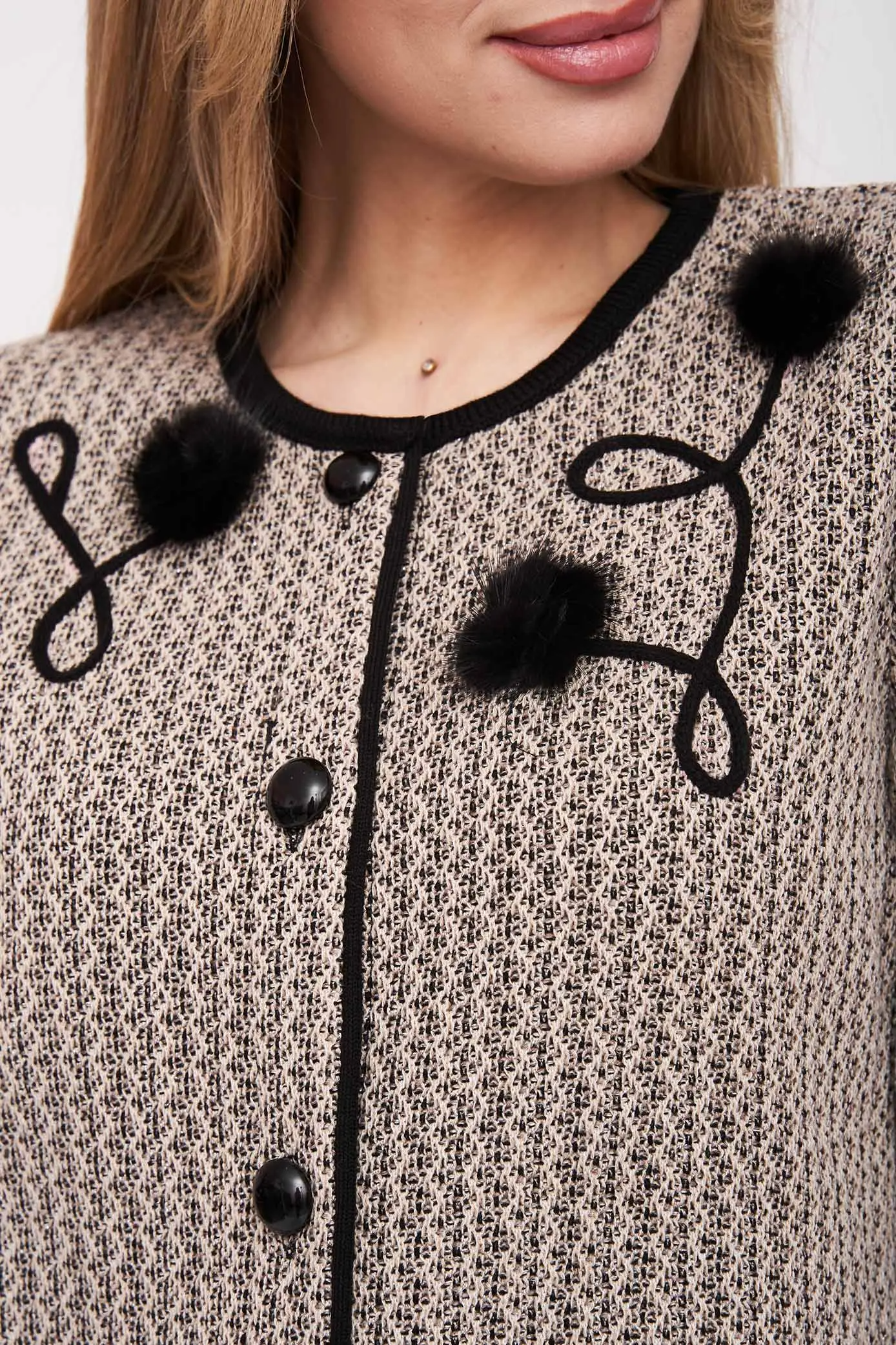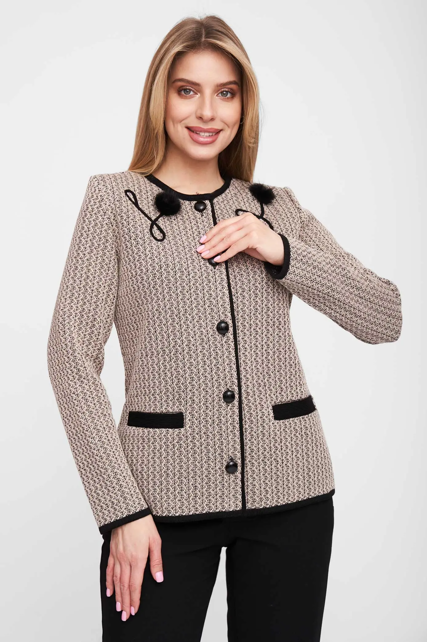 Жакет женский полуприлегающего силуэта с круглой горловиной.  Жакет застегивается на пуговицы контрастного цвета.  Рукава втачные длинные. Два прорезных кармана. Вязанный жакет выполнен жаккардовым переплетением.  Горловина, низ рукавов, низ изделия и вход в карманы выполнены контрастным цветом.  По верху полочек выложен рисунок трикотажным шнурком и мехом. бежевый