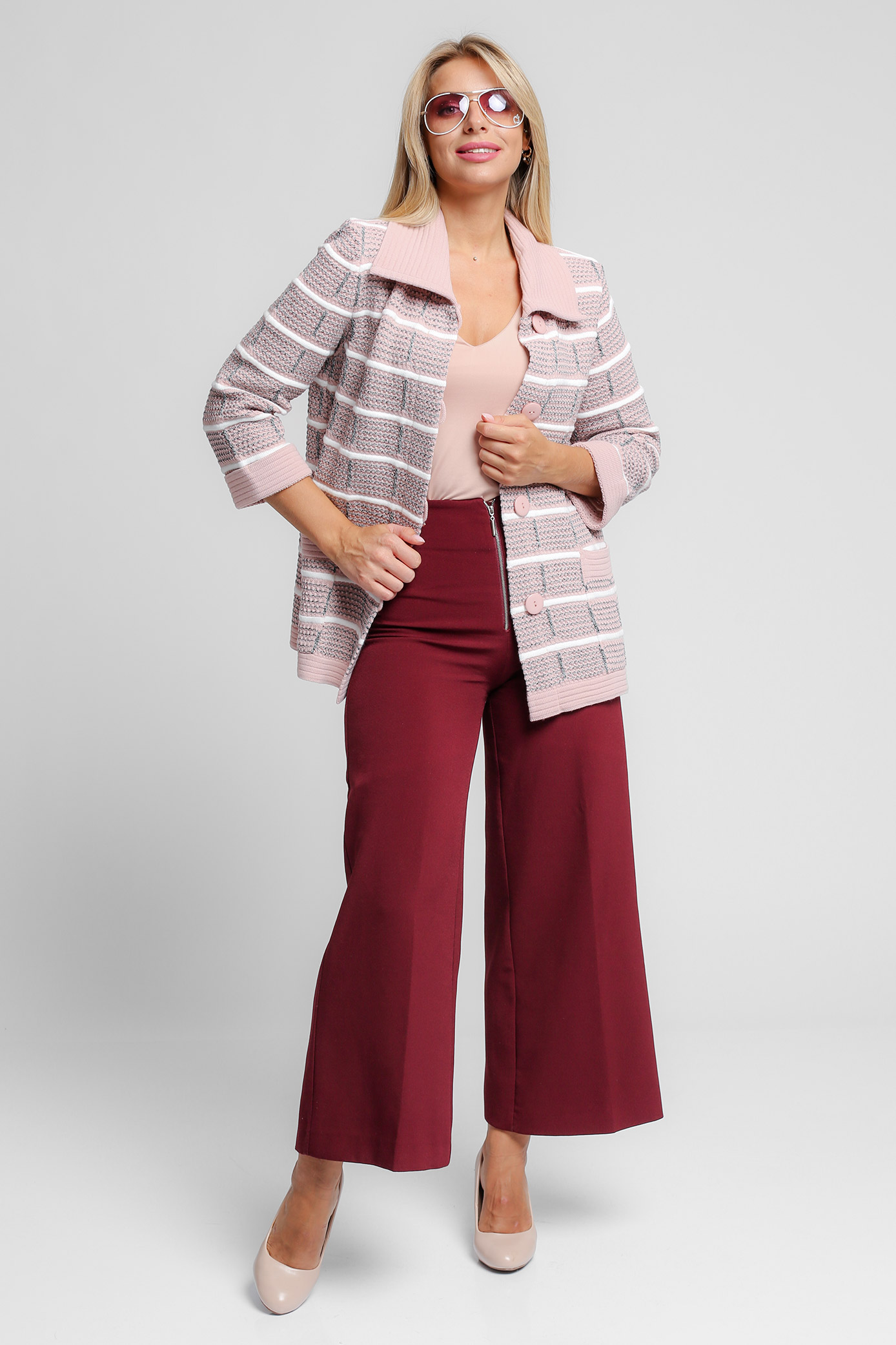 Вязаный женский жакет свободного силуэта с рубашечным отложным воротником.  Рукав втачной длиной 7/8 с отворотом.  По бокам два накладных кармана с листочкой. Жакет застегивается на пуговицы с навесной петлей. Изделие выполнено жаккардовым переплетением  образующим валики. пудра