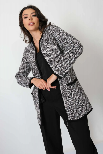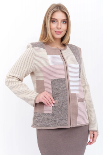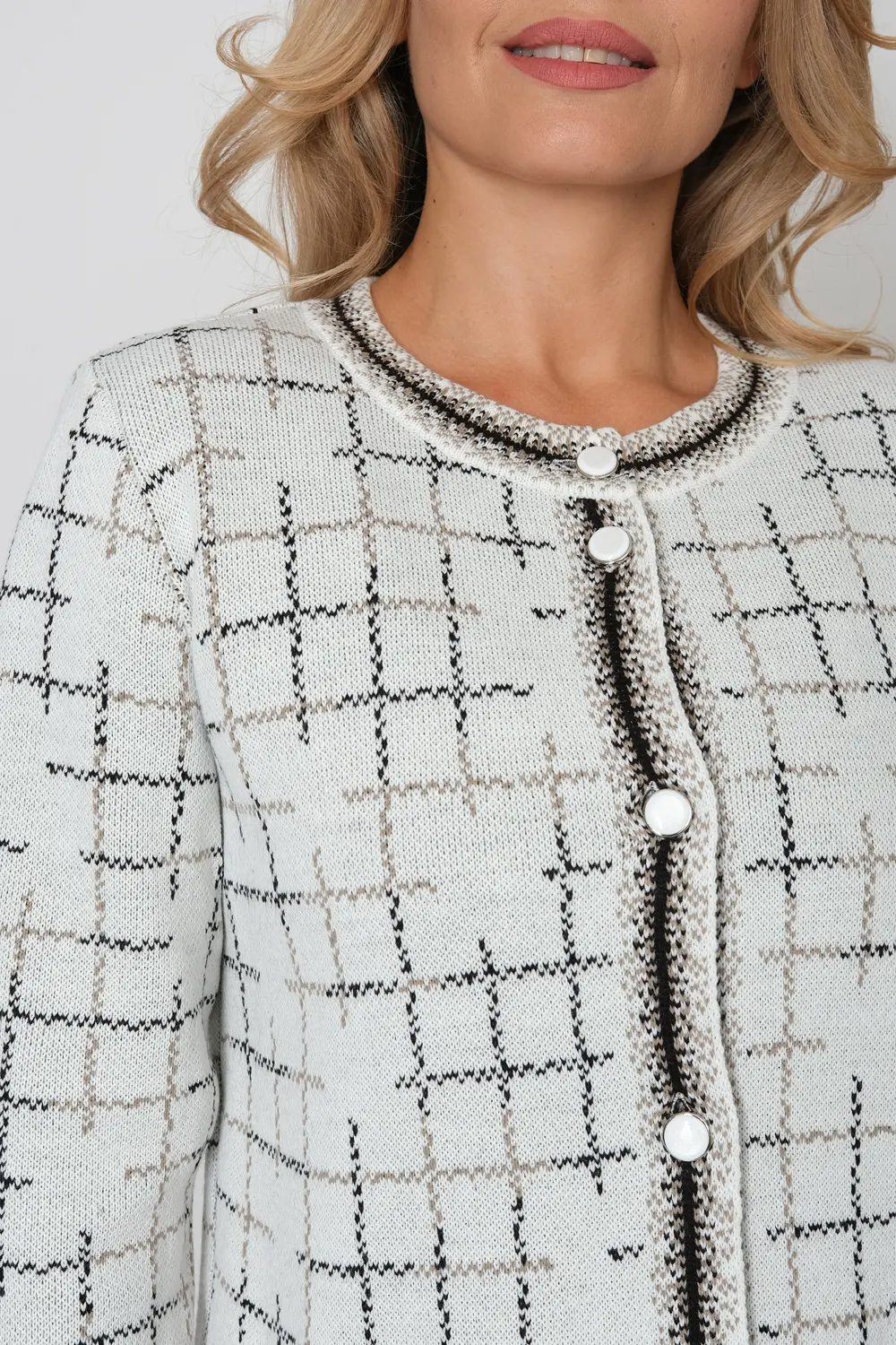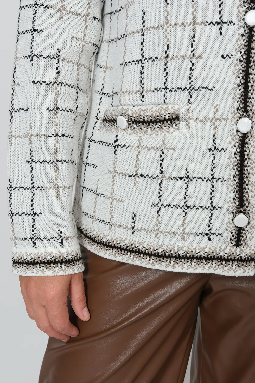 Жакет женский вязаный полуприлегающего силуэта в классическом стиле с круглым вырезом горловины и втачным рукавом полной длины. Застежка спереди на ряд крупных контрастных пуговиц. По бокам два прорезных кармана с пуговицей.  Жакет выполнен жаккардовым переплетением рисунок клетка. молочный