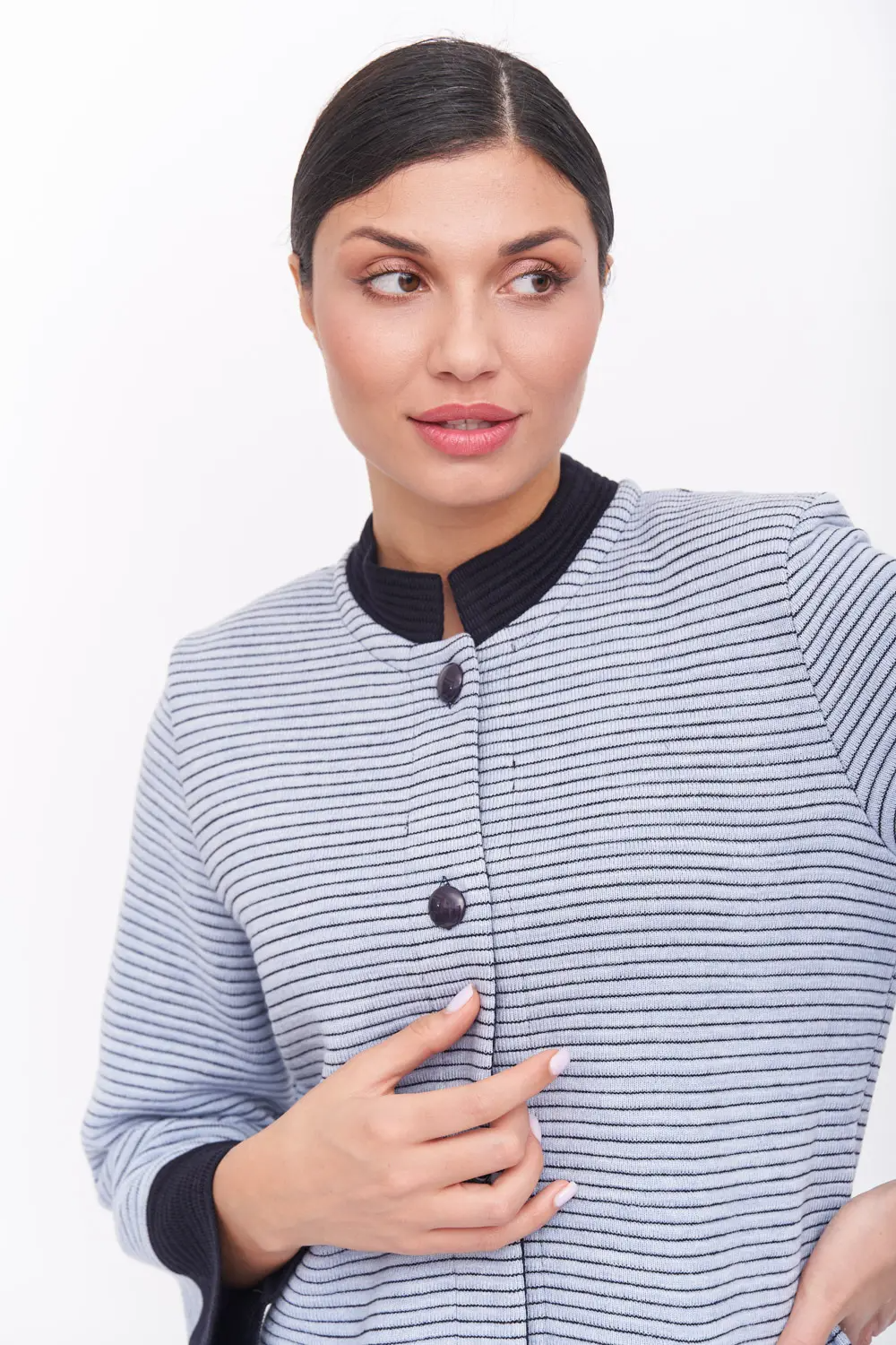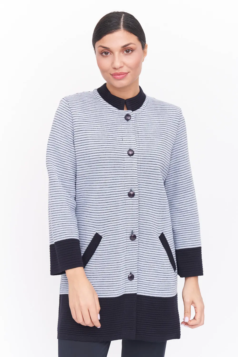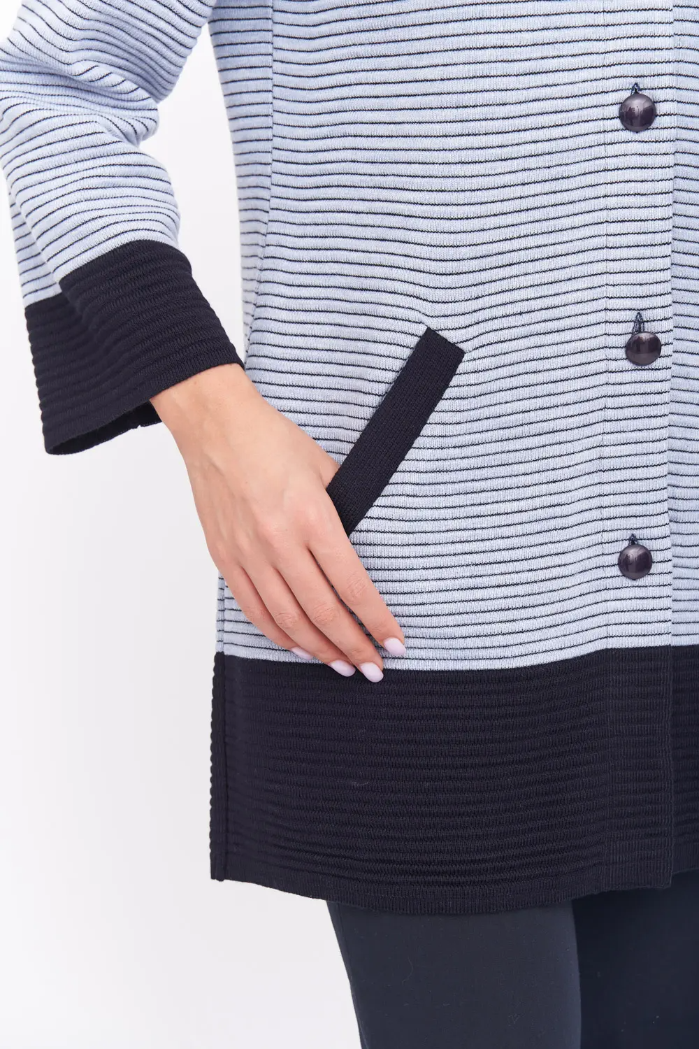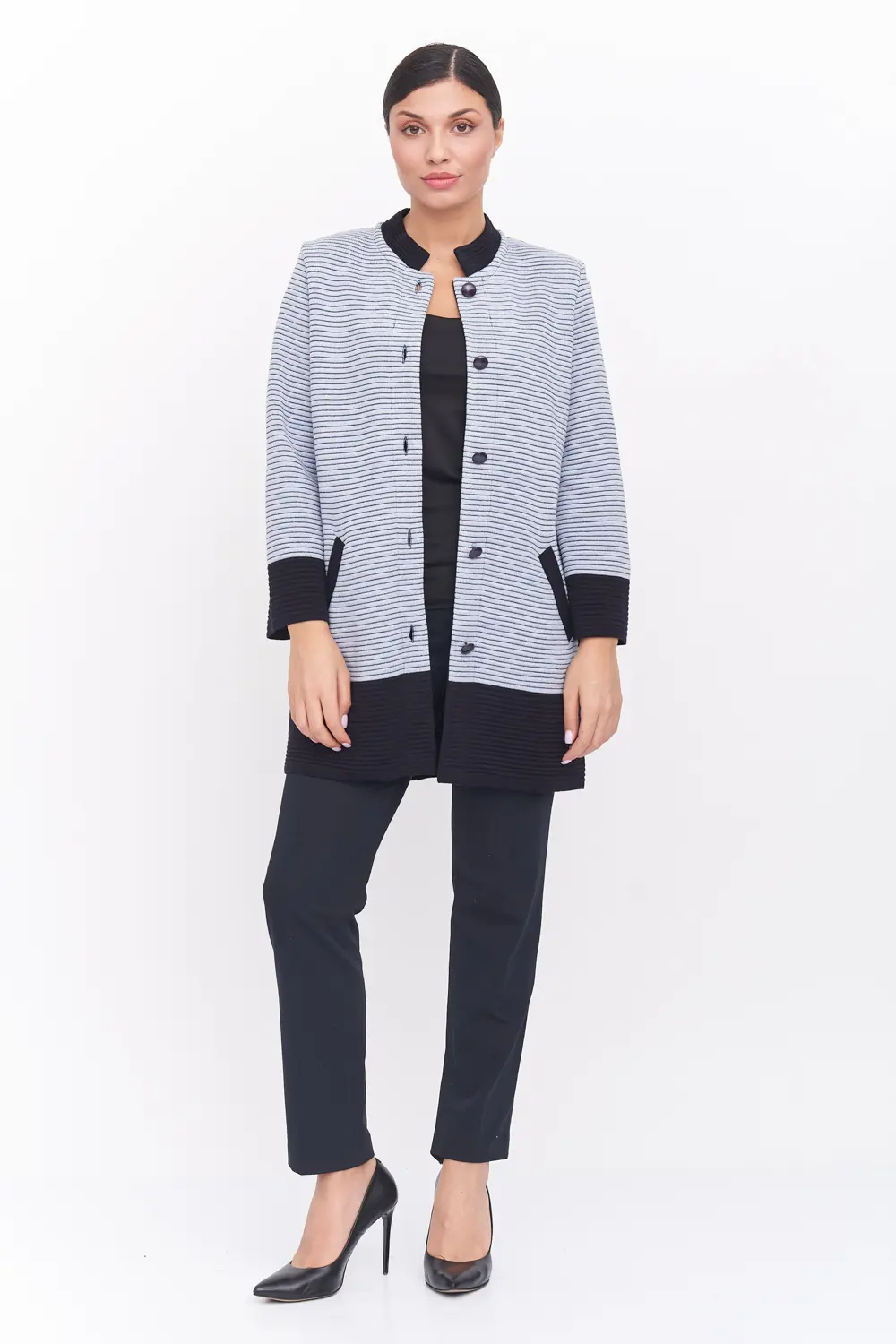 Жакет женский вязаный полуприлегающего силуэта с круглой горловиной и  маленькой стойкой, удлиненный.  Жакет на пуговицах по всей длине изделия. По бокам два прорезных кармана. Рукава втачные, длина 7/8. Жакет выполнен переплетением образующим валики  с  контрастным сочетанием отделки. сине-голубой