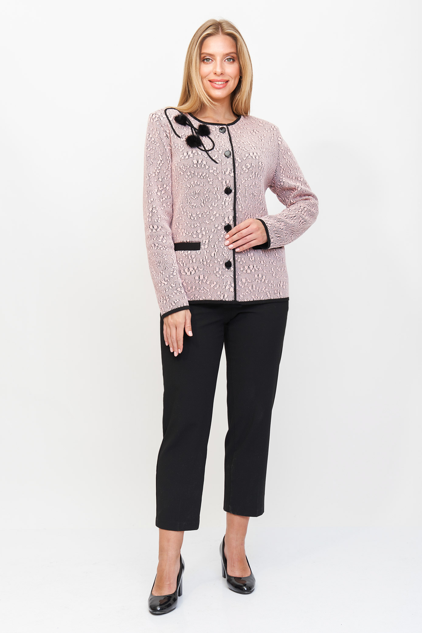 Женский вязаный жакет полуприлегающего силуэта на пуговицах. Трикотажный пиджак выполнен из высококачественной пряжи с составом 30% хлопок 70% ПАН. Теплая кофта на пуговицах имеет круглую горловину без воротника, рукава втачные длинные. Длина изделия 62 см, длина рукава 61 см. В трикотажном жакете предусмотрены функциональные прорезные карманы. Вязаный пиджак выполнен жаккардовым переплетением, образующим мерцающий орнамент.   Горловина, низ рукавов, низ изделия и вход в карманы обработаны бейкой  контрастного цвета. Нарядный жакет украшен элегантным узором из трикотажных шнуров и натурального меха кролика. Эффектный пиджак полуприлегающего силуэта подойдет для любого типа фигуры и составит модный, праздничный образ с любым низом: брюки, джинсы, юбка. черно-розовый