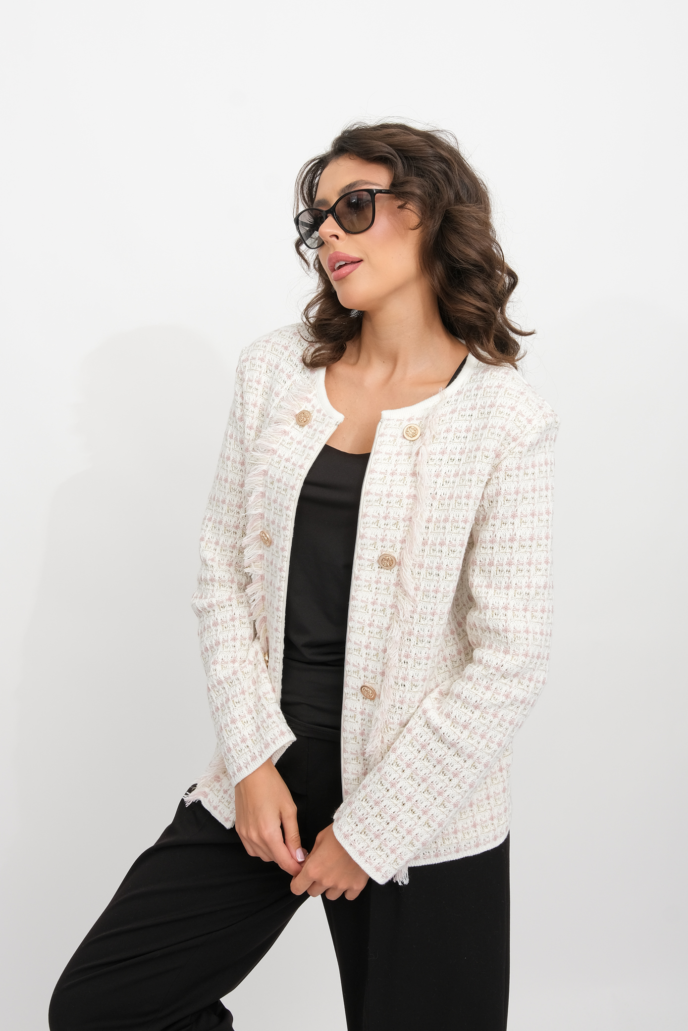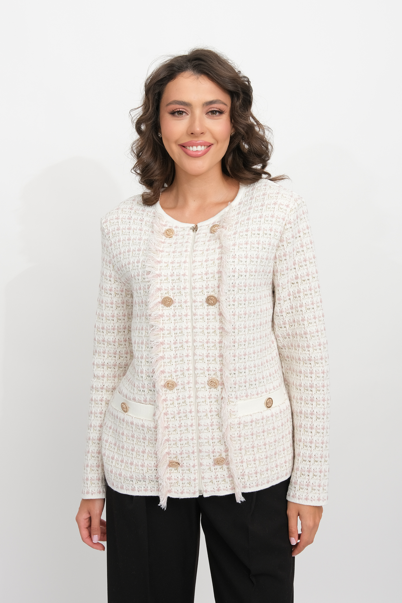 Жакет женский полуприлегающего силуэта с круглой горловиной.  Жакет вязаный на молнии.  Выполнен жаккардовым, структурным переплетением рисунок клетка.Прорезной карман с листочкой. Жакет выполнен в винтажном стиле, декорирован  бахромой и акцентными пуговицами. молочно-пудровый