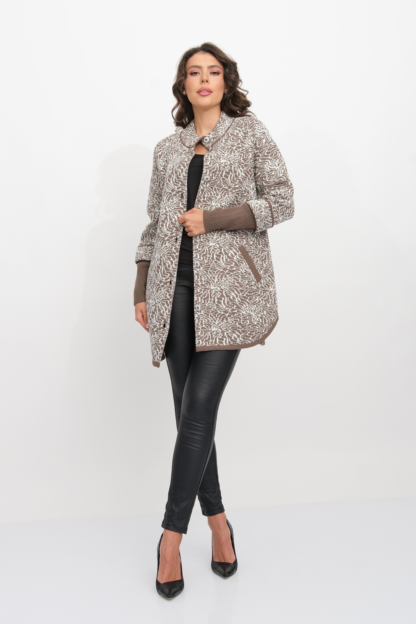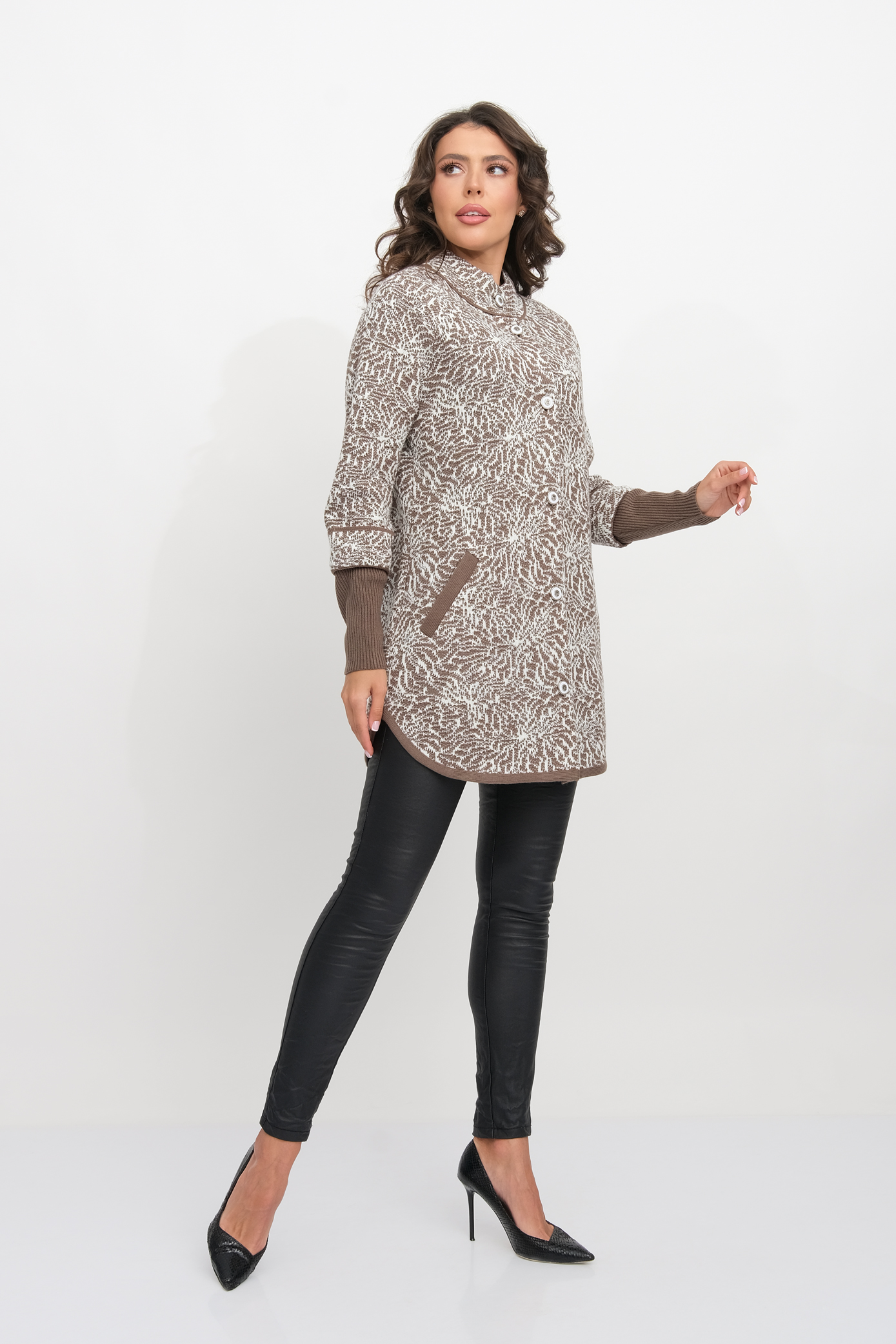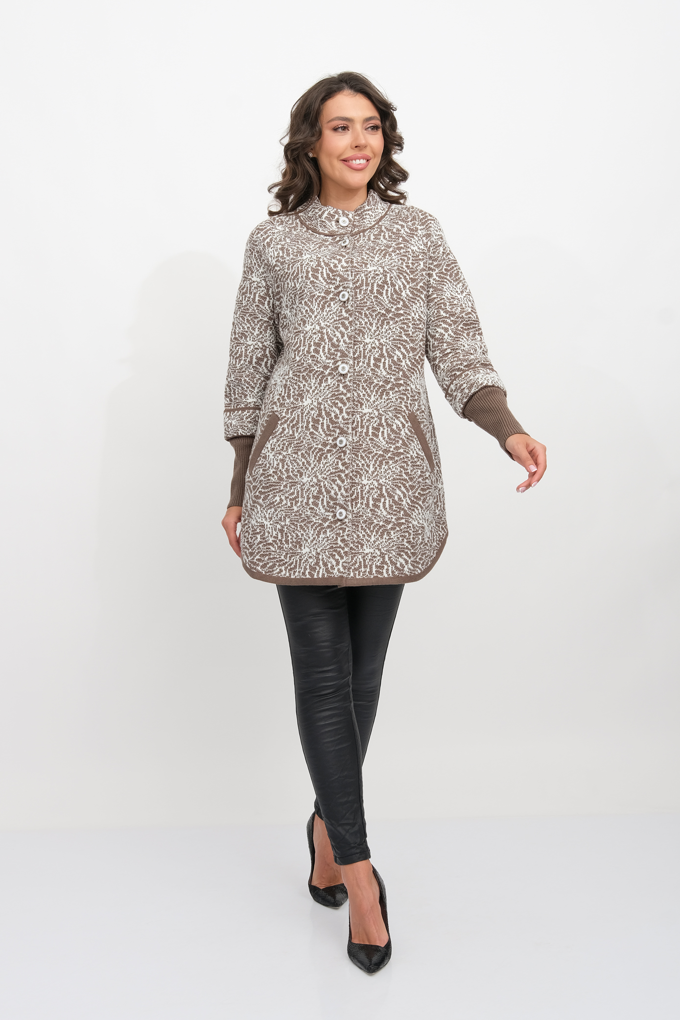 Элегантный вязаный жакет - несомненный хит сезона. Изумительно красивое полотно структурной вязки с мерцающей подсветкой по изнанке. Застежка на пуговицы, карманы в листочку, функциональные. Рукава длинные на манжете. Манжет фиксированный. Кардиган выглядит женственно и элегантно. Он отлично сочетается с юбкой-карандашом и брюками. кофе