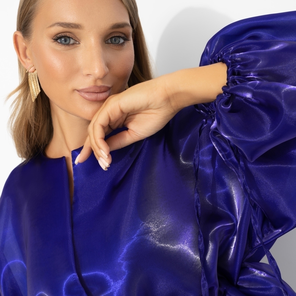 Для неё вечер начинался не с первого бокала, а с момента, когда на плечи ложилась лёгкая прохлада цвета ультрамарин. Жакет ЧАРУТТИ буквально стал частью вечернего неба, пойманной и превращённой в струящийся покров. Глубокий синий пигмент играл бликами при каждом её движении. В этом наряде она чувствовала себя не просто нарядной, а центром притяжения, загадочной и сияющей звездой в сумеречном городе. Жакет объемного кроя. Есть регулируемая кулиска на талии. Линия плеча спущена. Есть шнуровка по манжетам. Материал изделия с блеском.