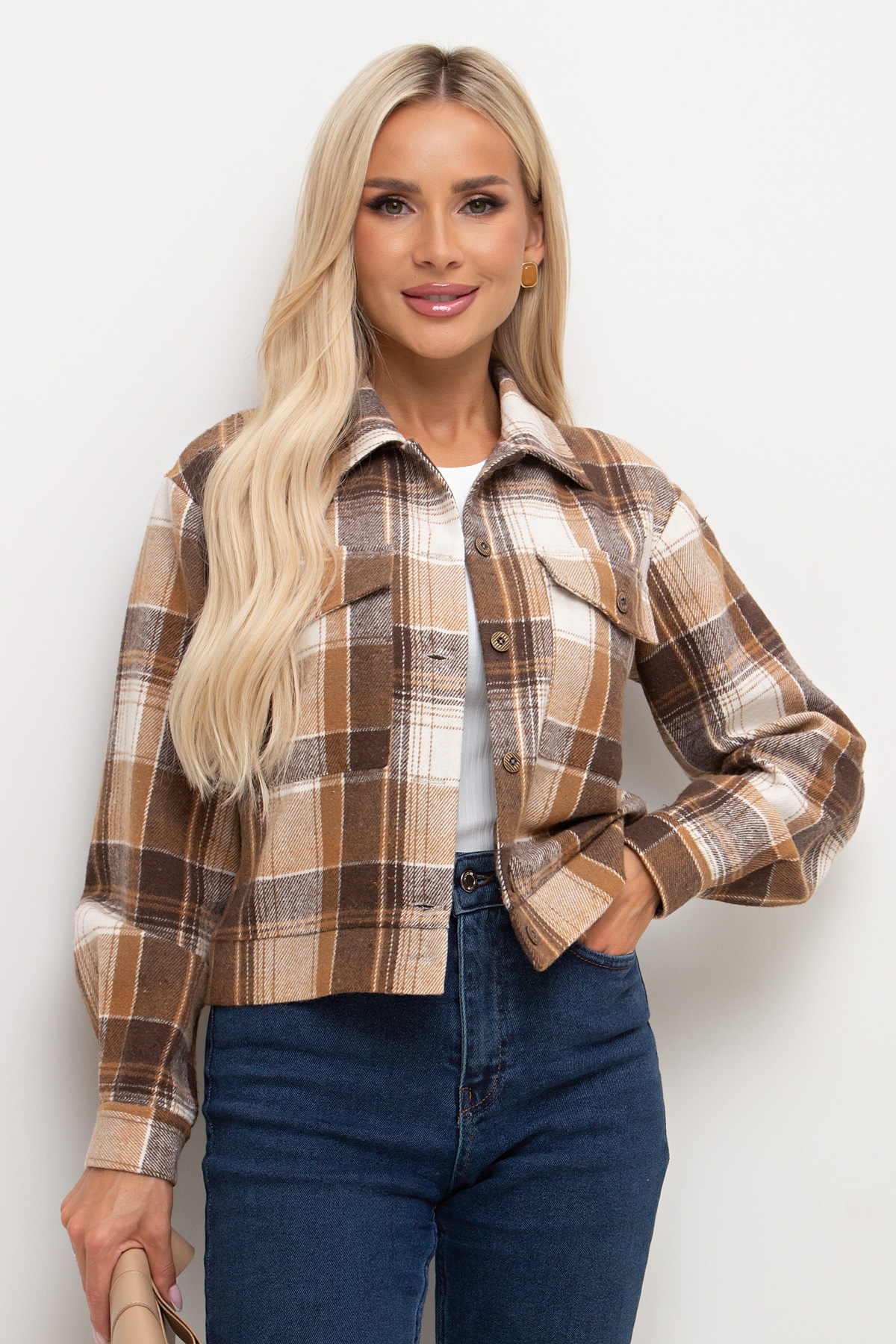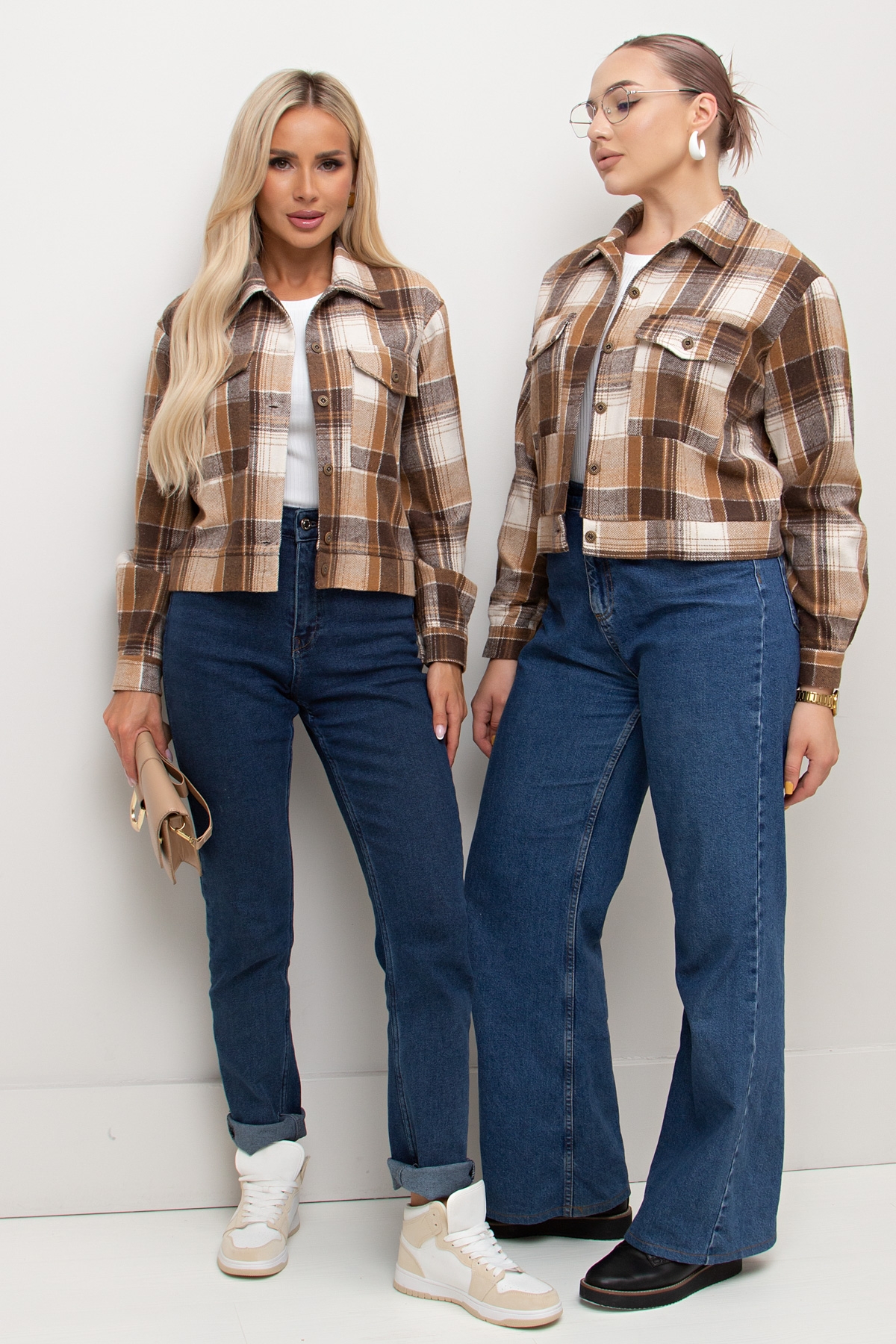 Кроп - жакет прямого кроя. Английский отложной воротник. Перед оформлен накладными карманами с клапанами. Длинный втачной рукав оканчивается притачной манжетой. Застежка на петли и пуговицы. Модель без подкладки. Низ ровный, оформлен манжетой.