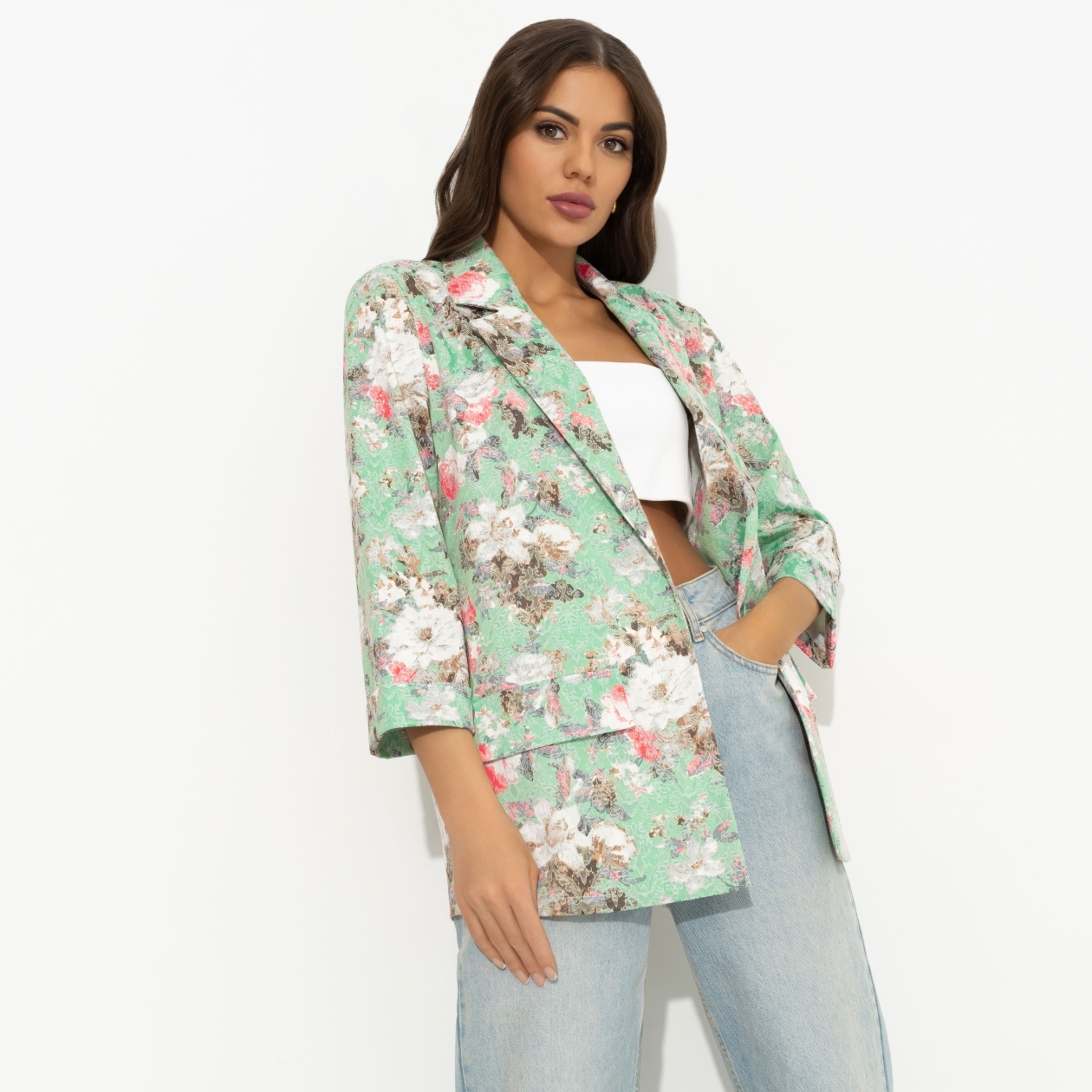 Важно объявить семье и коллегам, чтобы они не ждали разнообразия. Ты настолько влюбилась в жакет от CHARUTTI, что намерена носить его каждый день в разных образах. Это не от недостатка фантазии, а от большой любви. Жакет однобортный с лацканами прямого силуэта. Рукава укорочены. Имитация карманов. Изделие на подплечниках.