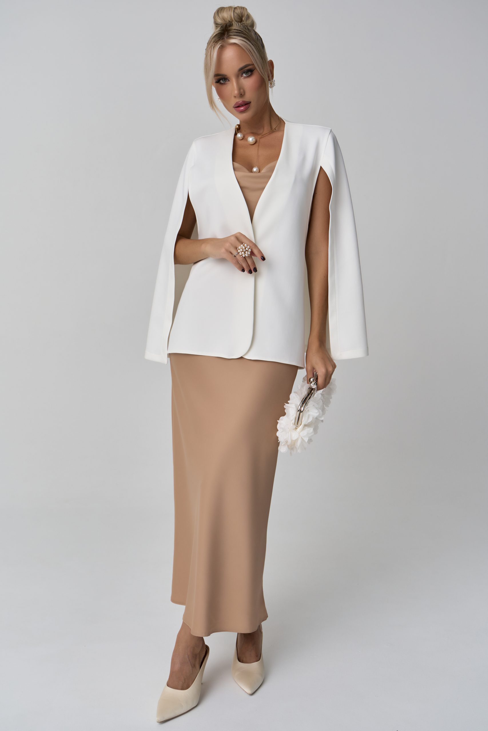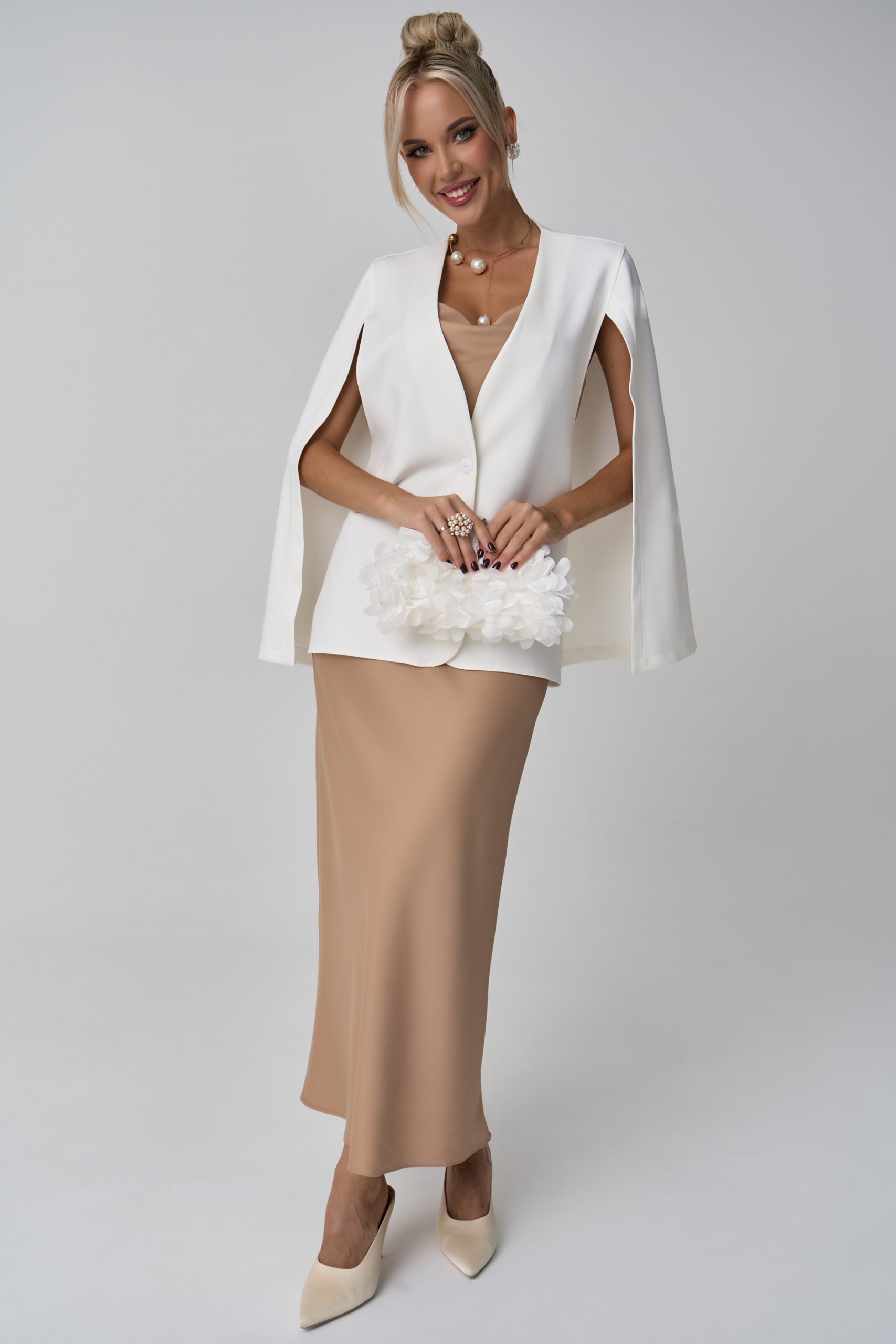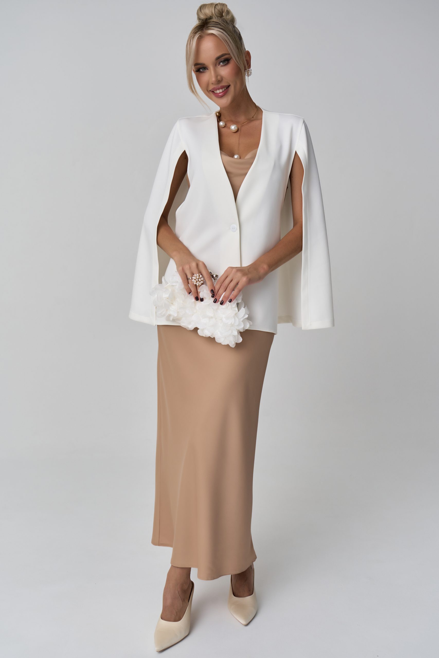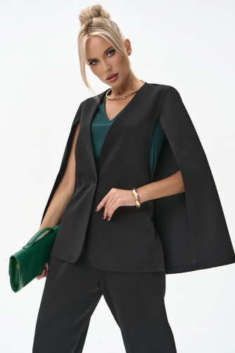 Лаконичный жакет – кейп, который станет основой современного гардероба. Чёткий крой подчёркивает линию плеч, создавая элегантный силуэт, а универсальная длина позволяет носить модель как с брюками, так и с юбками. Он прекрасно смотрится на любых фигурах, в том числе на больших размерах, подчёркивая достоинства и скрывая возможные недостатки. Выполнен из приятной на ощупь ткани, хорошо держит форму и не теряет актуальности со временем.