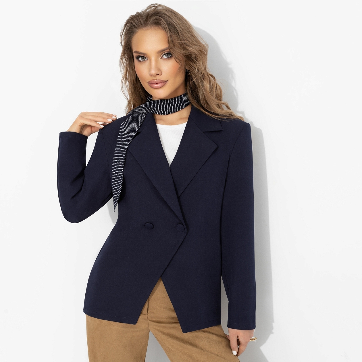 Акцентные плечи, лаконичный двубортный крой и глубокий синий оттенок – так выглядит спокойная, интеллигентная элегантность. Дизайнеры ЧАРУТТИ вдохновлялись образми Жаклин Кеннеди. Носи этот жакет с белым топом и прямыми джинсами или со светлыми брюками и лодочками. Полуприталенный силуэт с двубортной застёжкой на обтяжные пуговицы визуально подчёркивает талию, а классический воротник с лацканами делает модель универсальной для офисных и повседневных образов. Ты великолепна!