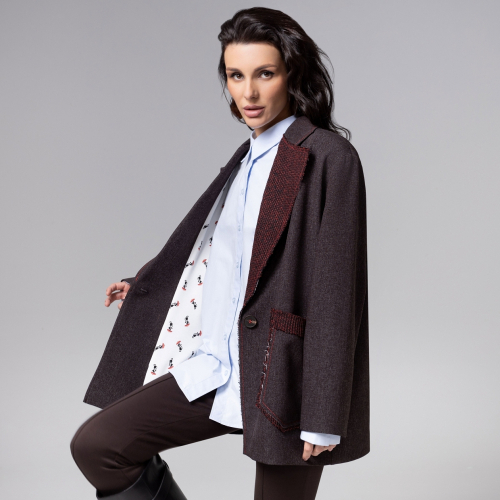 Женский объемный жакет ЧАРУТТИ в глубоких коричнево-бордовых оттенках выполнен в стиле «с мужского плеча». Изделие сочетает в себе мощь классического кроя и утонченную элегантность. На спинке дизайнерский принт. Его модный силуэт, акцентированный выразительными лацканами и объемными карманами, подчеркивает хрупкость фигуры, создавая эффектный контраст. Высокое качество пошива проявляется в безупречной посадке, точном структурировании формы и использовании роскошных материалов. Продуманная конструкция с яркой износостойкой подкладкой обеспечивает комфорт и сохраняет безупречный вид даже при длительном ношении. Ткань с легким блеском. Жакет с подплечниками.