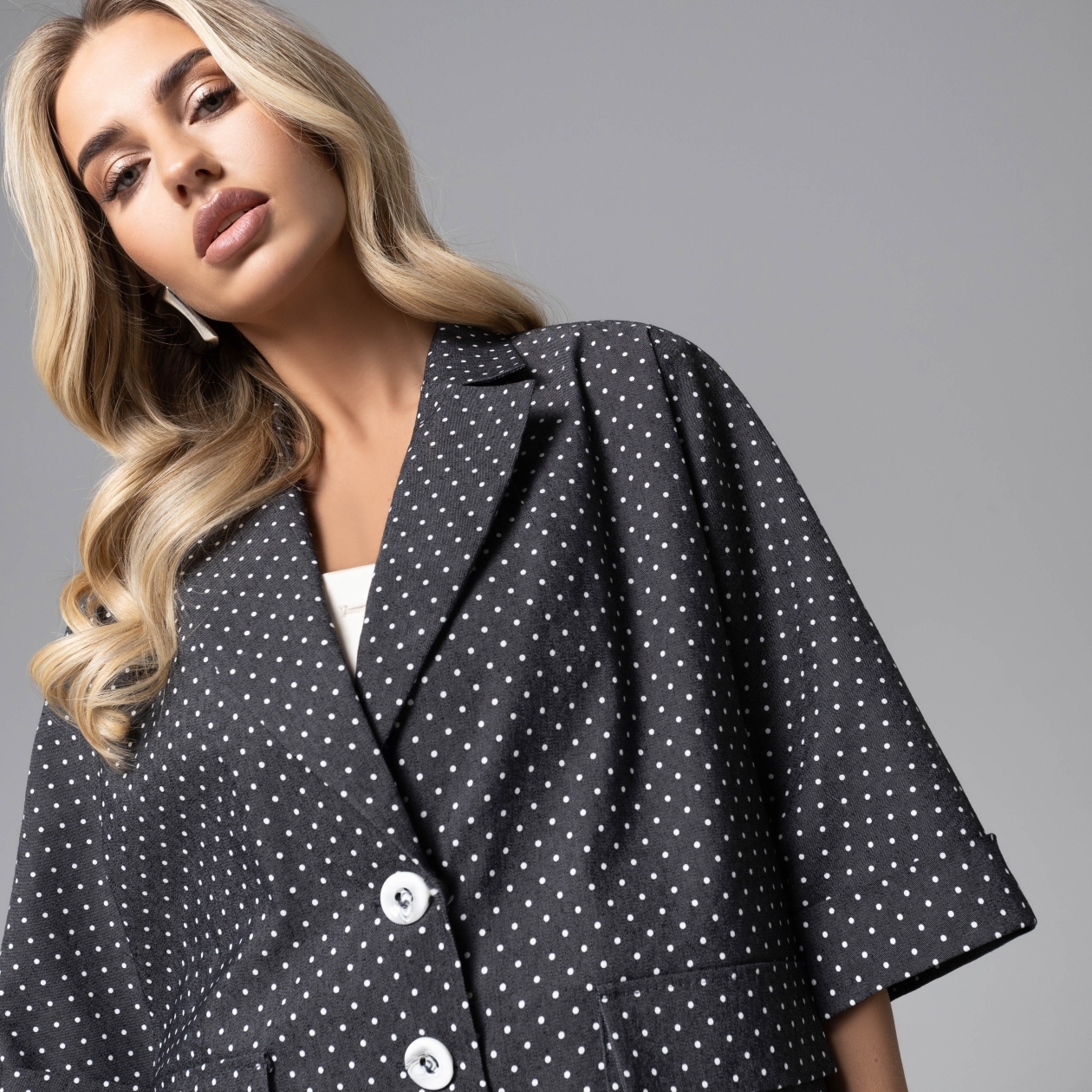 Превосходство в модной игре будет всегда за вами. Торжество элегантности в жакете в мелкий горох из коллекции PREMIUM. Жакет прямого кроя с лацканами. Жакет свободного кроя с лацканами, однобортный. Изделие с подплечниками и карманами, без подклада. Деликатные разрезы по бокам изделия. Хлопок хорошо держит форму. Можно стилизовать с юбками, брюками и джинсами.