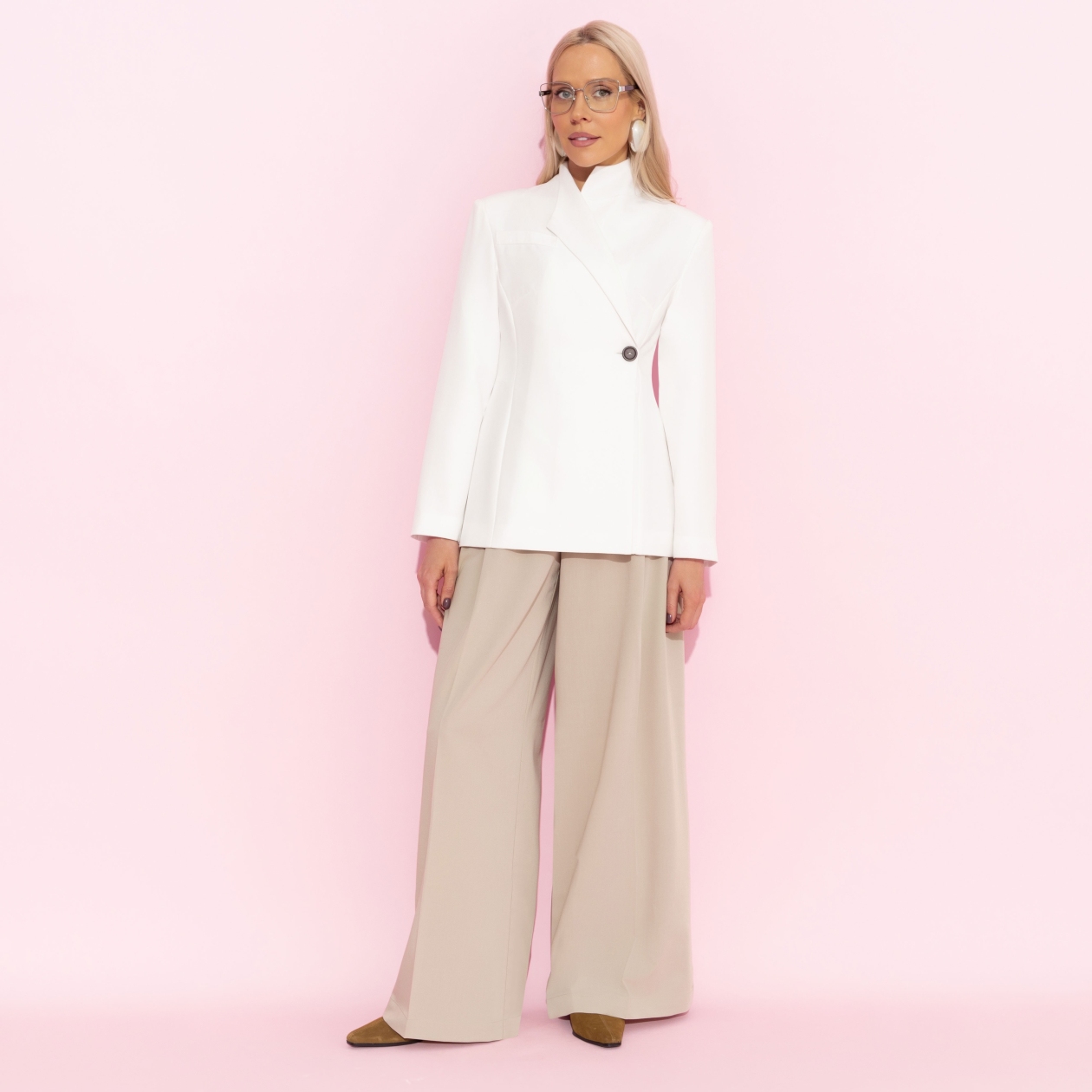 Ты в белом жакете CHARUTTI, и на всё у тебя есть собственное мнение. Жакет не пальто, но создает имидж принципиальной и прямолинейной барышни, а тебе только это и нужно. Из хорошей девочки ты превращаешься в умную и расчетливую. Жакет однобортный с акцентными ассиметричными лацканами. Приталенный силуэт. Акцентная пуговица. Изделие с подкладом на подплечниках. За счет перемещенной дальше от центра пуговицы, модель в белом цвете отличается от аналогичной модели в изумрудном и бежевом оттенках тем, что больше подчеркивает силуэт и выделяет талию.