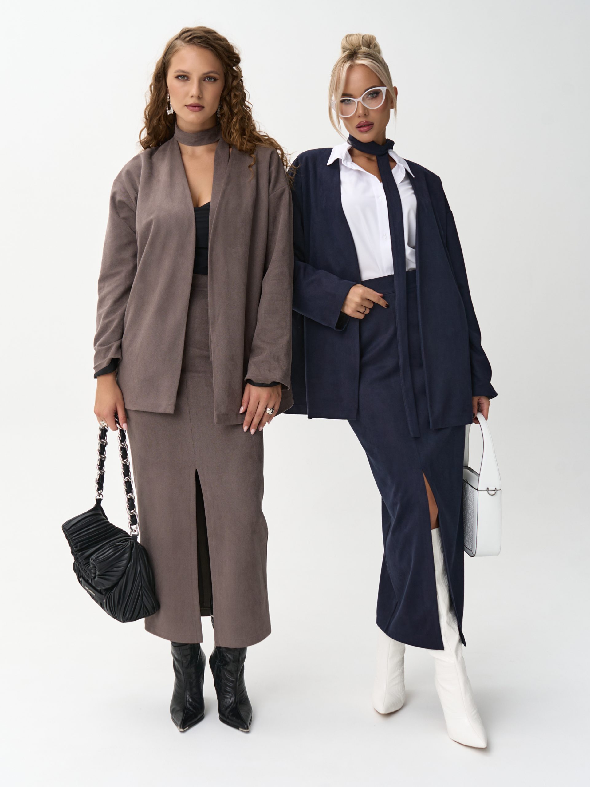Чтобы подобрать идеальную посадку, мы разделили костюм на два отдельных товара: жакет и юбка продаются отдельно — вы можете выбрать нужный размер для каждой части.
