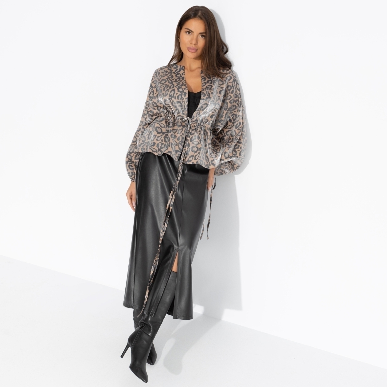 Кто сказал, что леопард – это перебор? В органзе он звучит так утончённо, что даже офисные стены завидуют. Вершина восхищения? О да. Жакет на завязках. Линия плеча спущена. Посадка свободная. Материал изделия с блеском.