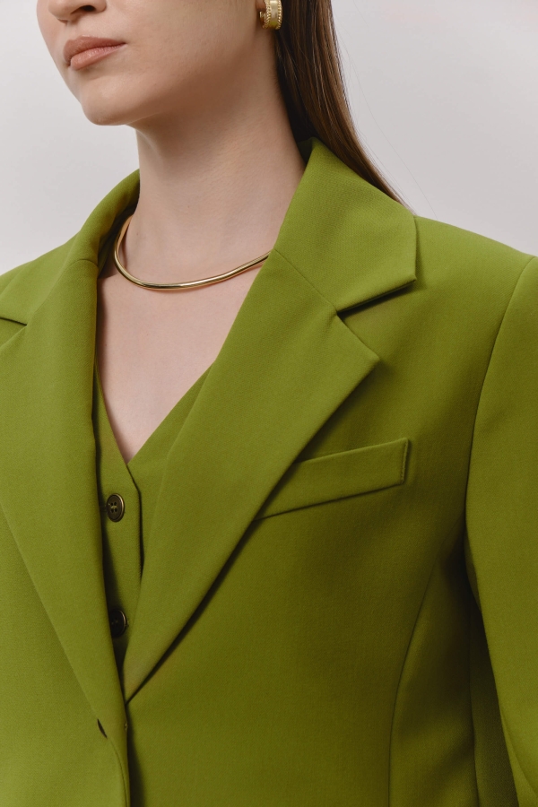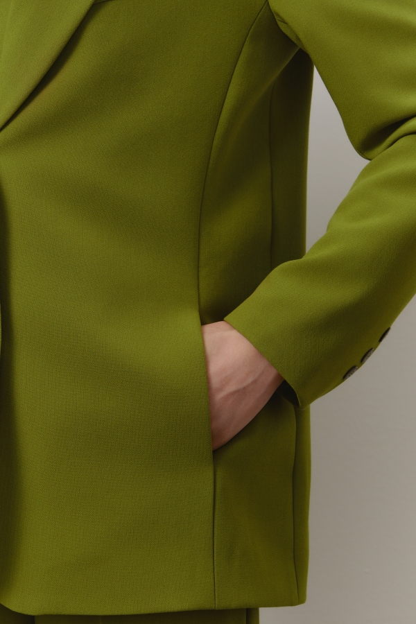 Жакет прямого силуэта из костюмного полотна. По переду застёжка на петли и пуговицы, карманы в рельефном шве. Воротник английский. Рукав длинный. Изделие на подкладке из поливискозы.
