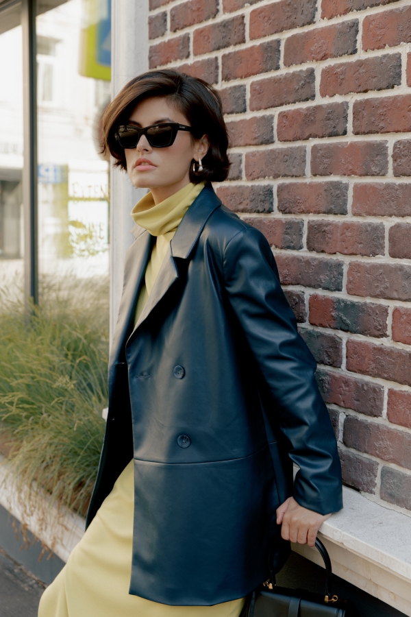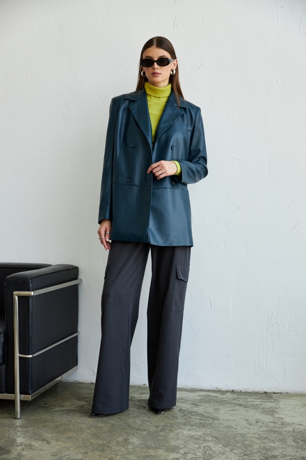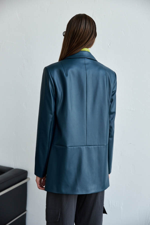 Двубортный жакет свободной формы из эко-кожи высокого качества на подкладке из поливискозы. По переду застежка на петли пуговицы в рельефе карманы. Воротник английский. Изделие на подкладе.