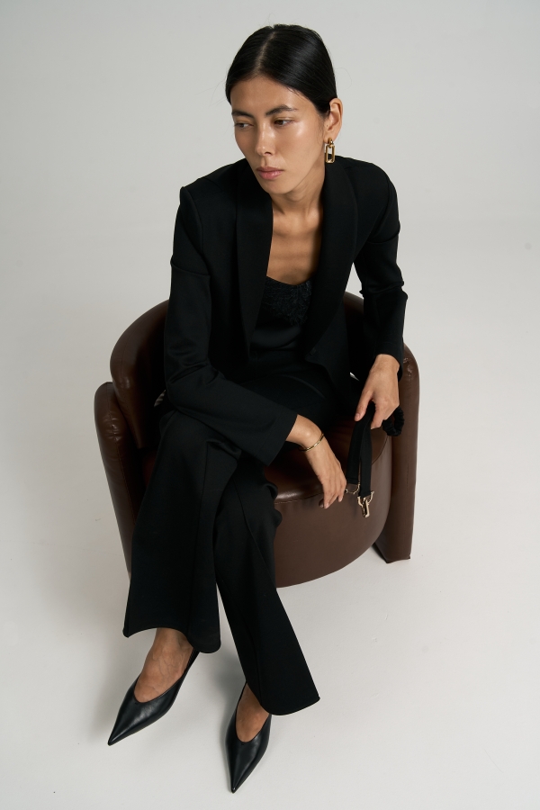 Модель прилегающего силуэта. Шалевый воротник. По переду карманы в рельефных швах. Застежка на пуговицу. В комплекте пояс