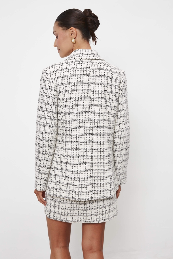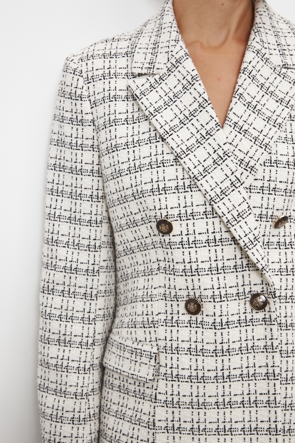 Твидовый жакет для любого случая. Модель полуприлегающего силуэта с двубортной застёжкой на акцентные пуговицы. По переду прорезные карманы с клапанами. Воротник английский. Рукав втачной, длинный. Изделие на подкладке из поливискозы.