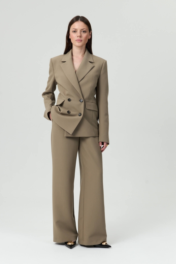 Жакет из костюмного полотна. Модель полуприлегающего силуэта с двубортной застежкой на пуговицы. Воротник английский. Рукав втачной. Прорезные карманы с клапанами. Изделие на подкладке из поливискозы.