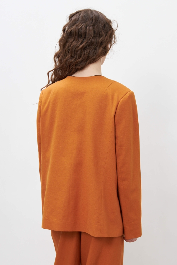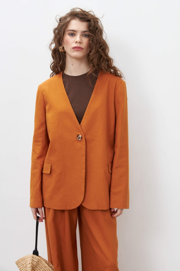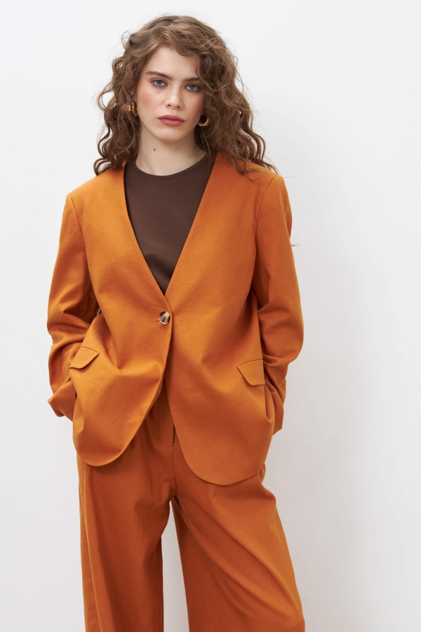 Комфортный стильный жакет для любого случая в трендовом оттенке. Овер сайз модель свободного силуэта без воротника, с прорезными карманами и клапанами, застежка на пуговицу и петлю.