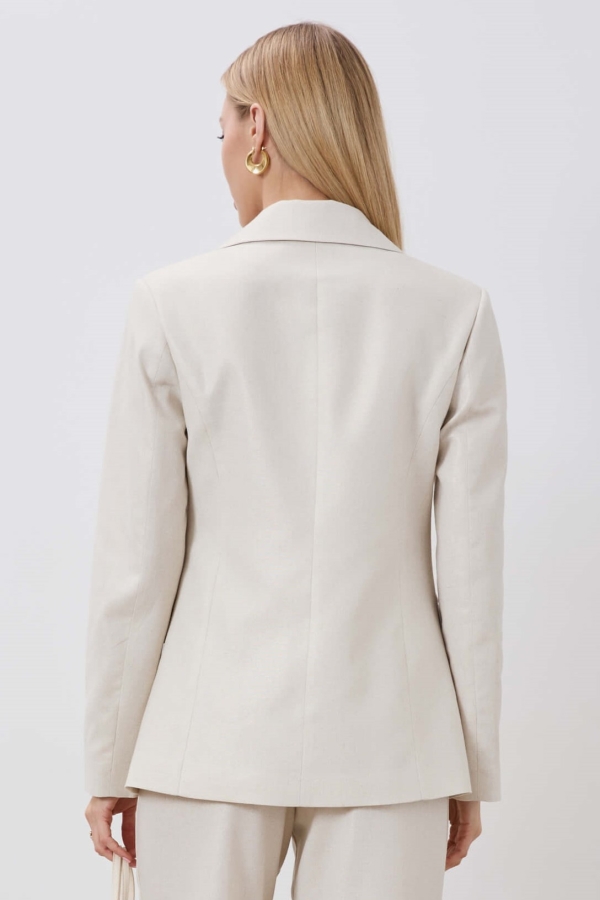 Классический жакет из льна с напылением. Модель полуприлегающего силуэта с застежкой на акцентные пуговицы. По переду прорезные карманы с клапанами. Воротник английский. Рукав втачной, длинный.