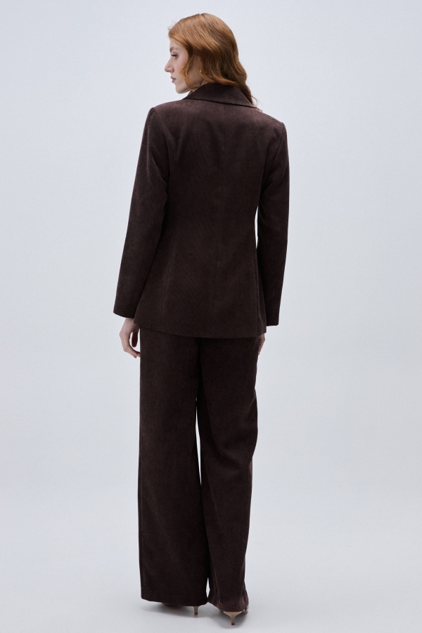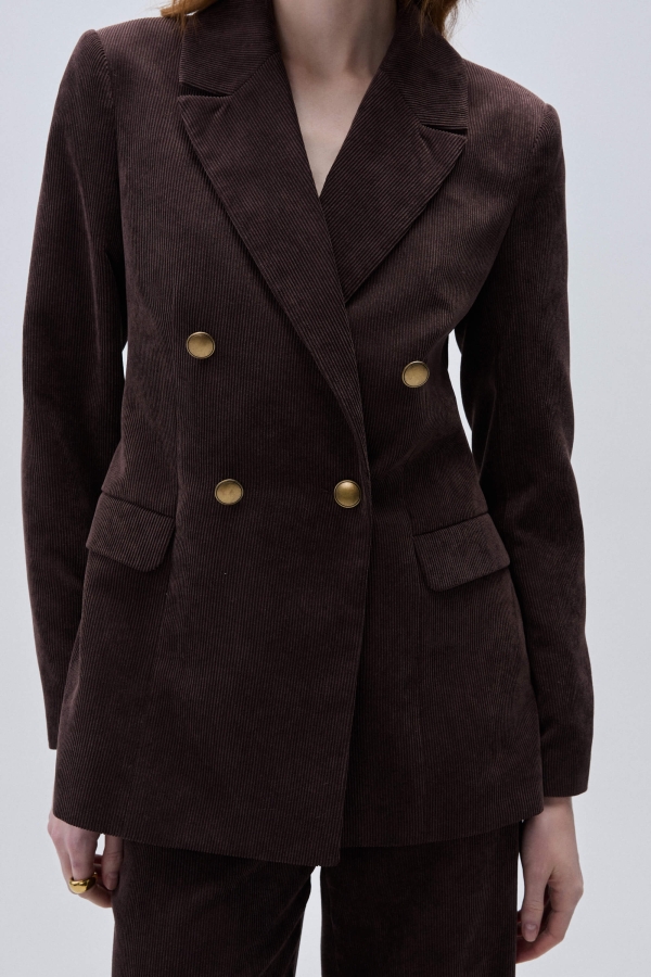 Вельветовый жакет с акцентными пуговицами. Модель полуприлегающего силуэта с двубортной застежкой на акцентные пуговицы. По переду прорезные карманы с клапанами. Воротник английский. Рукав втачной, длинный.