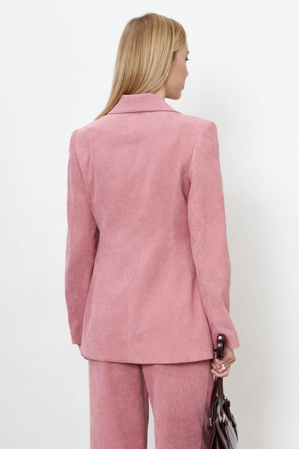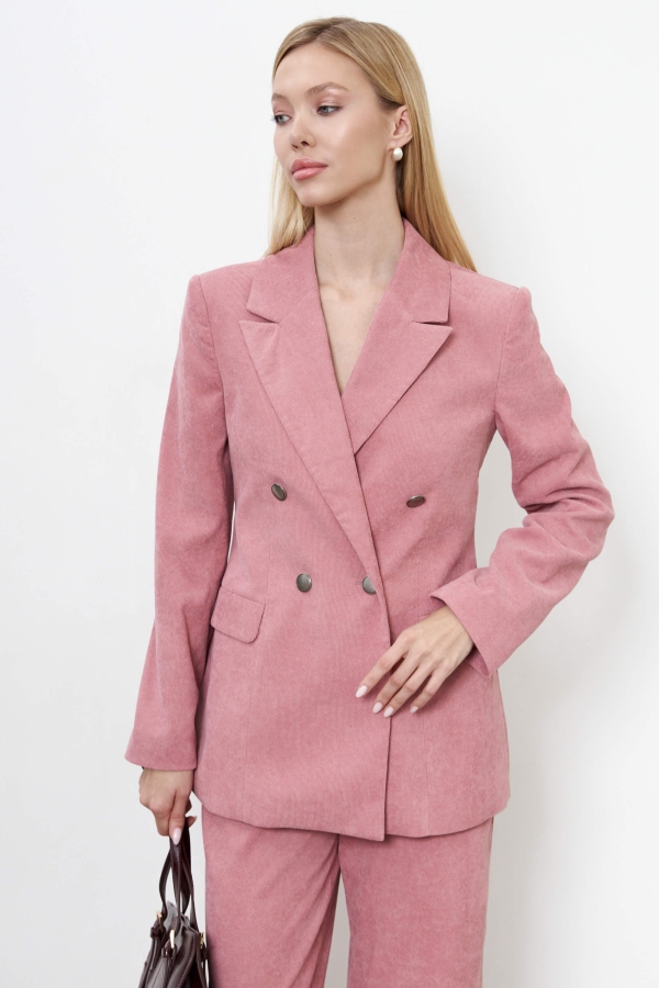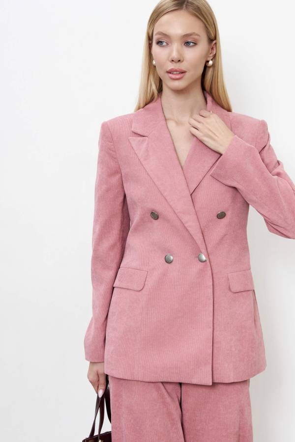 Вельветовый жакет для любого случая. Модель полуприлегающего силуэта с двубортной застежкой на акцентные пуговицы. По переду прорезные карманы с клапанами. Воротник английский. Рукав втачной, длинный.