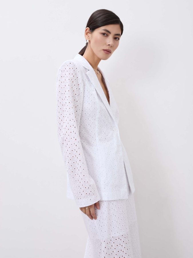 Стильный легкий жакет из хлопкового шитья на подкладке из батиста. Приталенный жакет умеренного объема, однобортный, с английским воротником.
