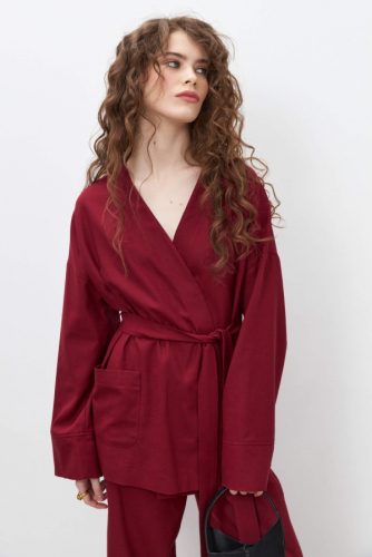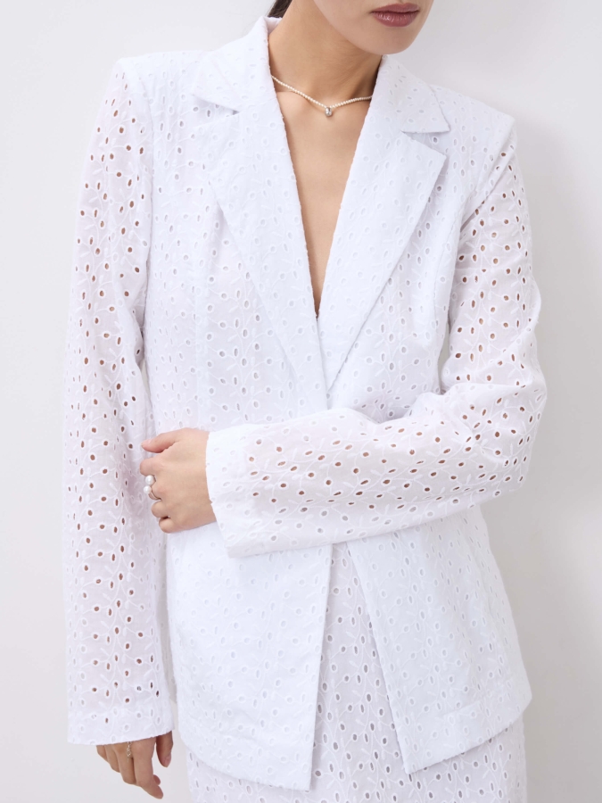 Стильный легкий жакет из хлопкового шитья на подкладке из батиста. Приталенный жакет умеренного объема, однобортный, с английским воротником.