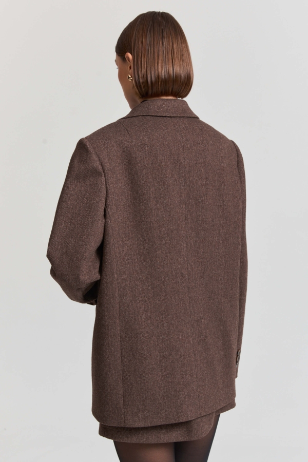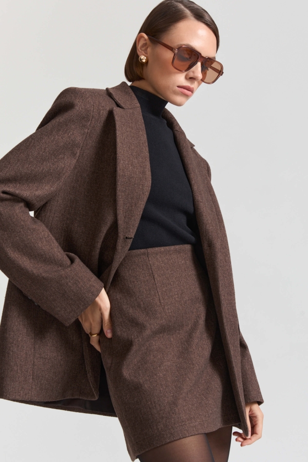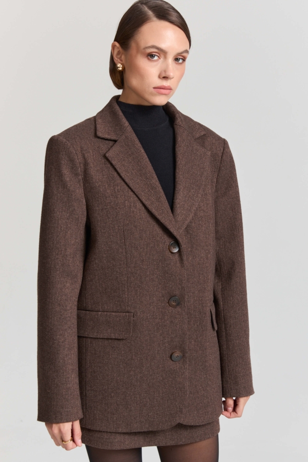 Облегченное пальто-пиджак на подкладке из поливискозы. Однобортная прямая свободная модель с английским воротником. Застежка на петли и пуговицы, прорезные карманы с накладными клапанами.
