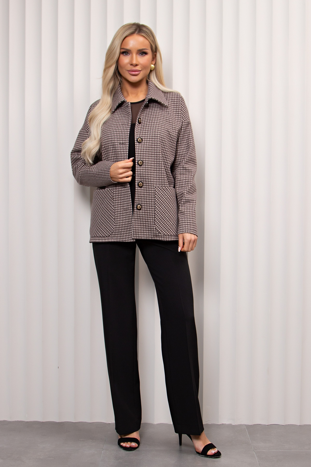 Комфортный жакет прямого силуэта из драповой ткани. Длинный втачной рукав со спущенным плечом. Отложной воротник. По переду накладные карманы. По центру застежка на петли и пуговицы. Модель без подкладки.