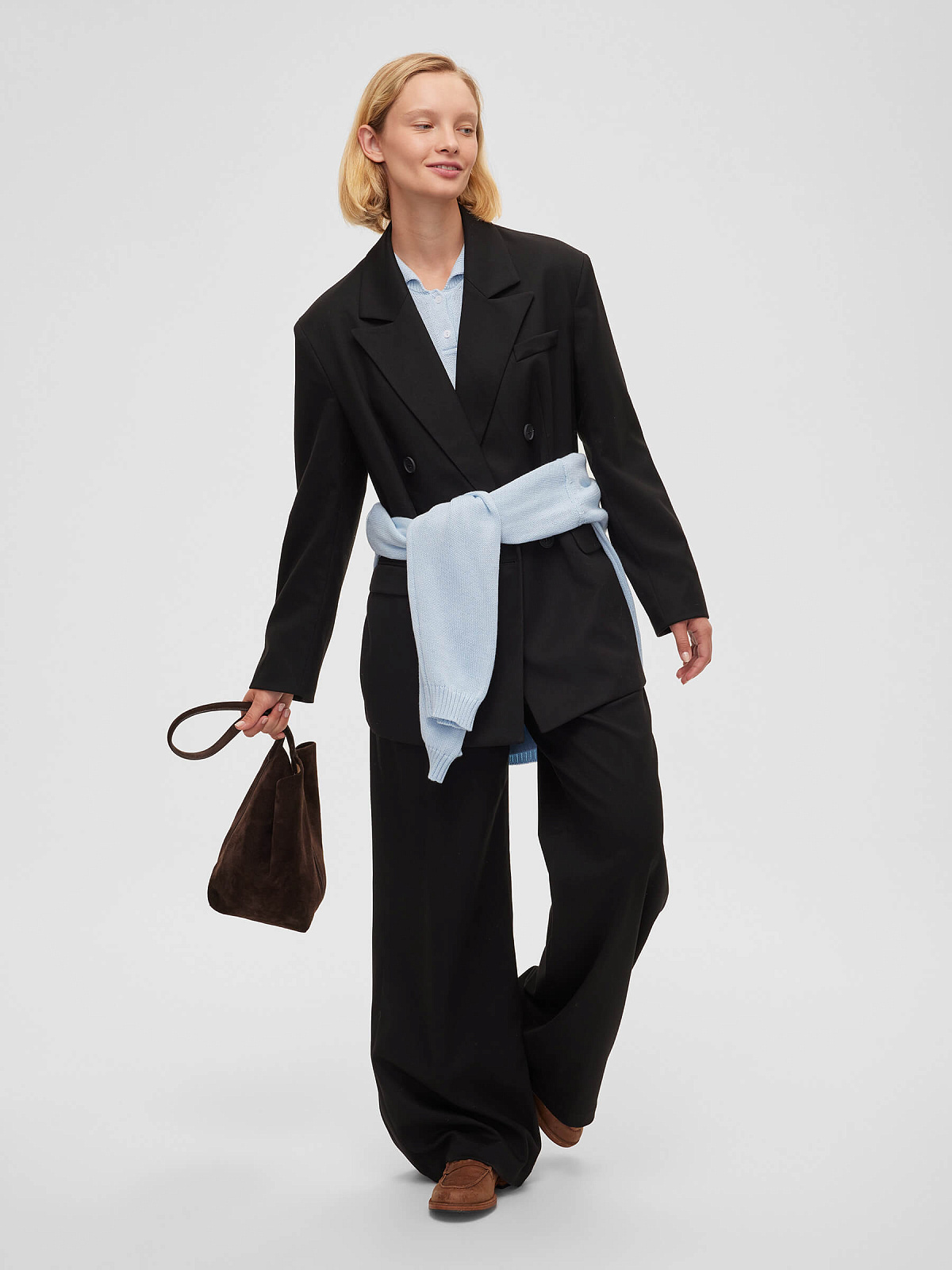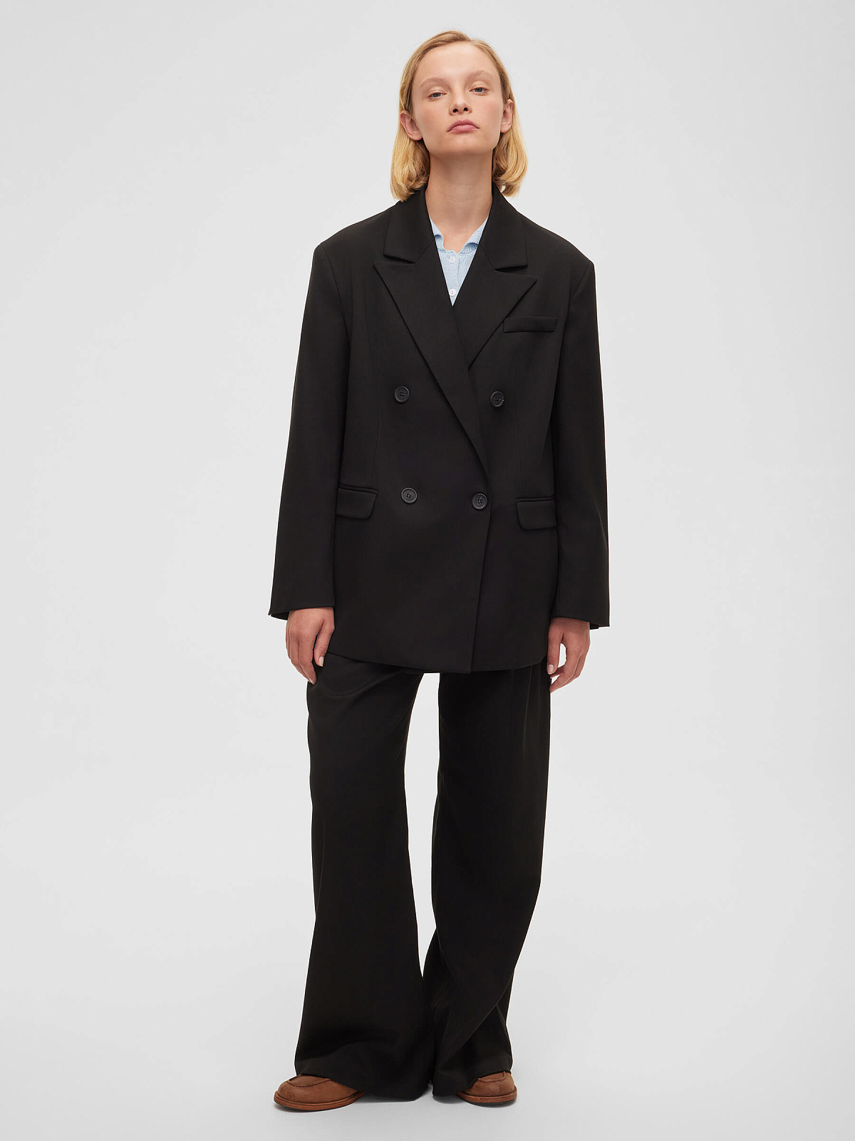 Классический двубортный жакет свободного кроя станет универсальным элементом вашего гардероба, идеально подходящим для любых случаев. Жакет выполнен из качественной костюмной ткани на подкладе, оснащен застежкой на пуговицы, воротником пиджачного типа и двумя прорезными карманами с клапанами.