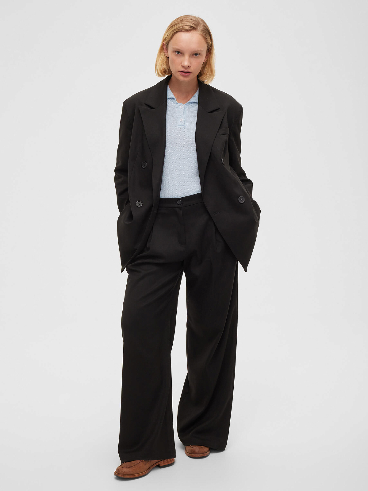 В комплекте с брюками свободного кроя с защипами этот жакет создает гармоничный и современный образ. Такой костюм легко сочетать как с рубашками для официальных мероприятий, так и с футболками и поло для повседневной носки, позволяя вам выглядеть гармонично в любой ситуации.