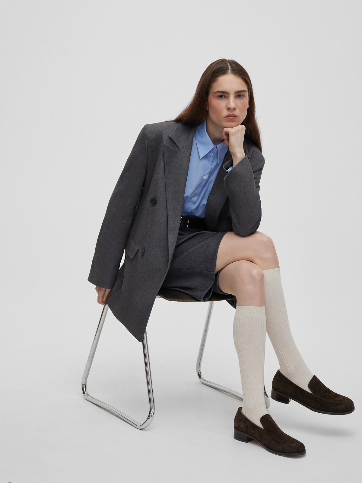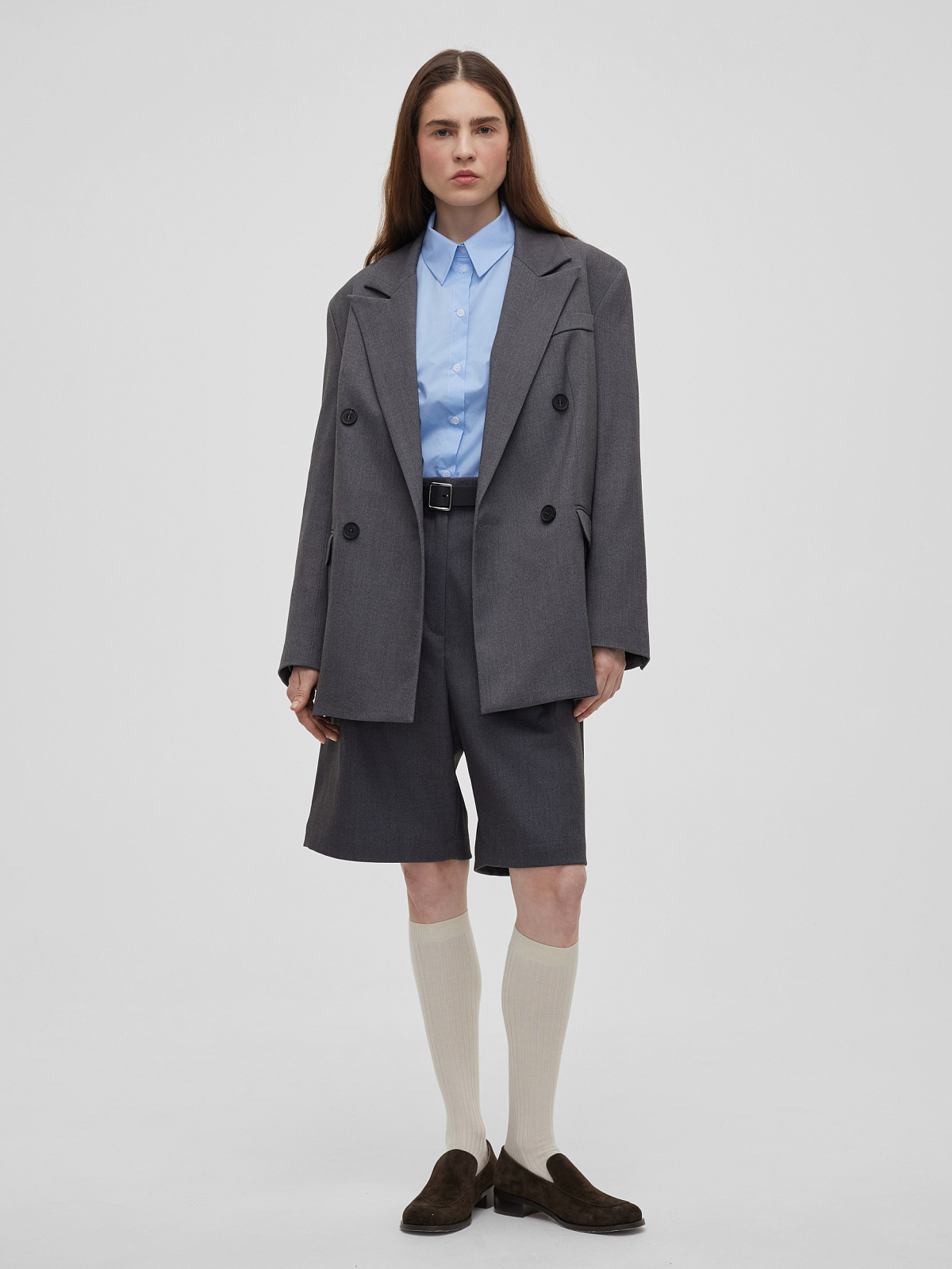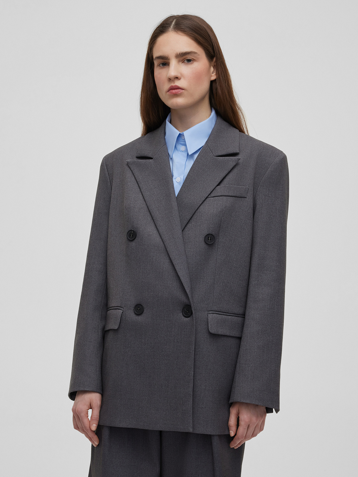 Классический двубортный жакет свободного кроя станет универсальным элементом вашего гардероба, идеально подходящим для любых случаев. Жакет выполнен из качественной костюмной ткани на подкладе, оснащен застежкой на пуговицы, воротником пиджачного типа и двумя прорезными карманами с клапанами.