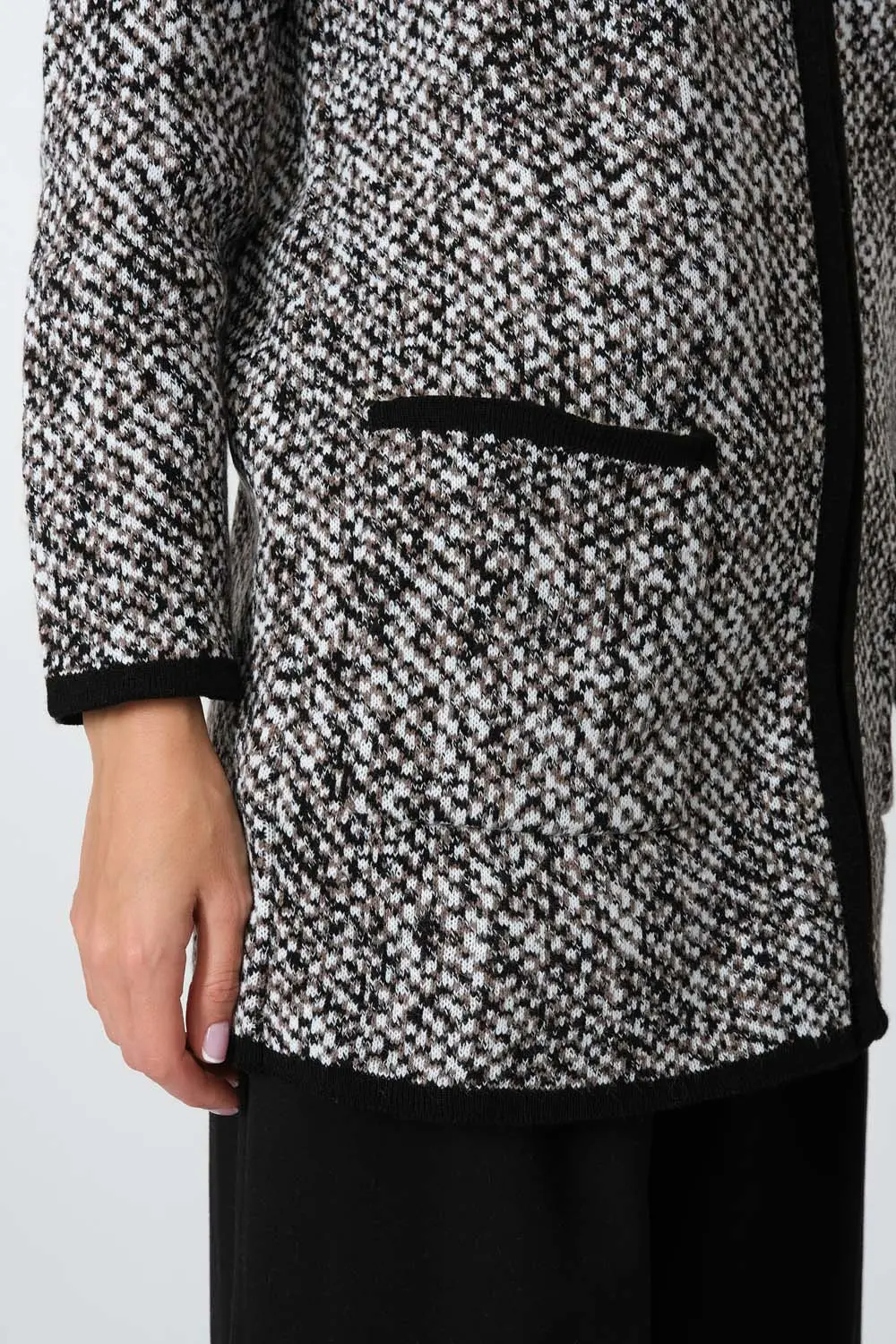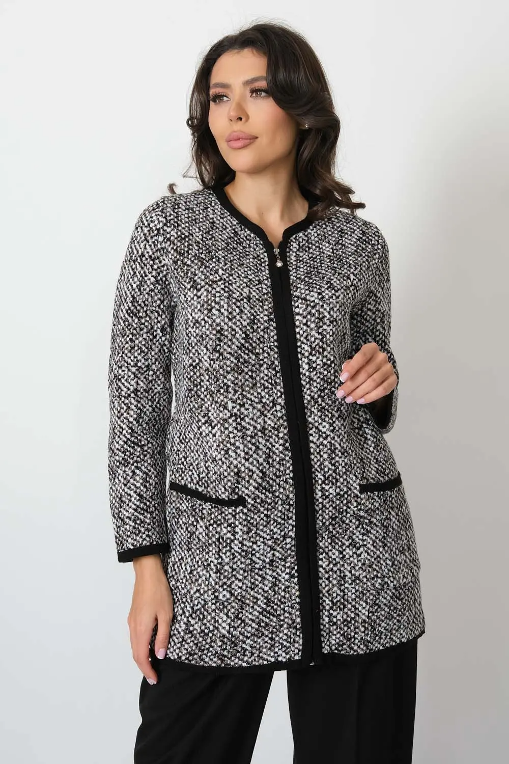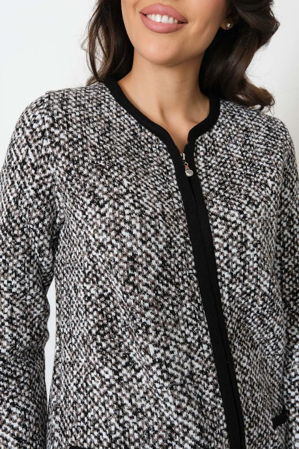 Женский вязаный жакет полуприлегающего силуэта с круглой горловиной без воротника. Модель удлиненная - длина составляет 75 см. Жакет застегивается на молнию по всей длине, края бортов обработаны контрастной бейкой. В модели выполнены функциональные карманы, края которых также обработаны бейкой. Жакет изготовлен из высококачественной пряжи с составом 30% шерсть, 70% ПАН. Рукава втачные, длинные. Жакет выполнен жаккардовым переплетением нитей 3-оттенков. Модель отлично дополнит Ваш деловой образ и подойдет для повседневной носки. В сочетании с классическими брюками или юбкой любой длины Вы будете выглядеть строго и официально. В сочетании с джинсами, в этом жакете можно пойти на вечеринку или на прогулку с друзьями. кофейный микс
