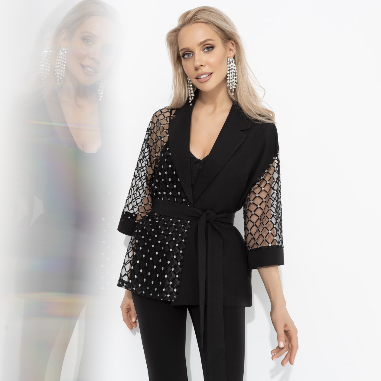 Ваши желания стали смелее. Силуэт уверенный, энергия – тёплая, а настроение – будто в воздухе растворён флирт. Жакет действует как талисман любви: он не меняет вас, он раскрывает вас. Тех, кто замечает этот свет, жизнь приводит сама. Любовь рядом – потому что вы в резонансе. Жакет из костюмной ткани с фактурной сеткой. Отлично смотрится на разных типах фигур.