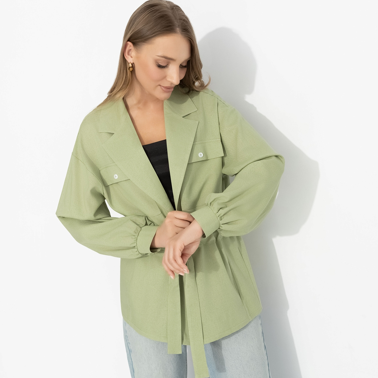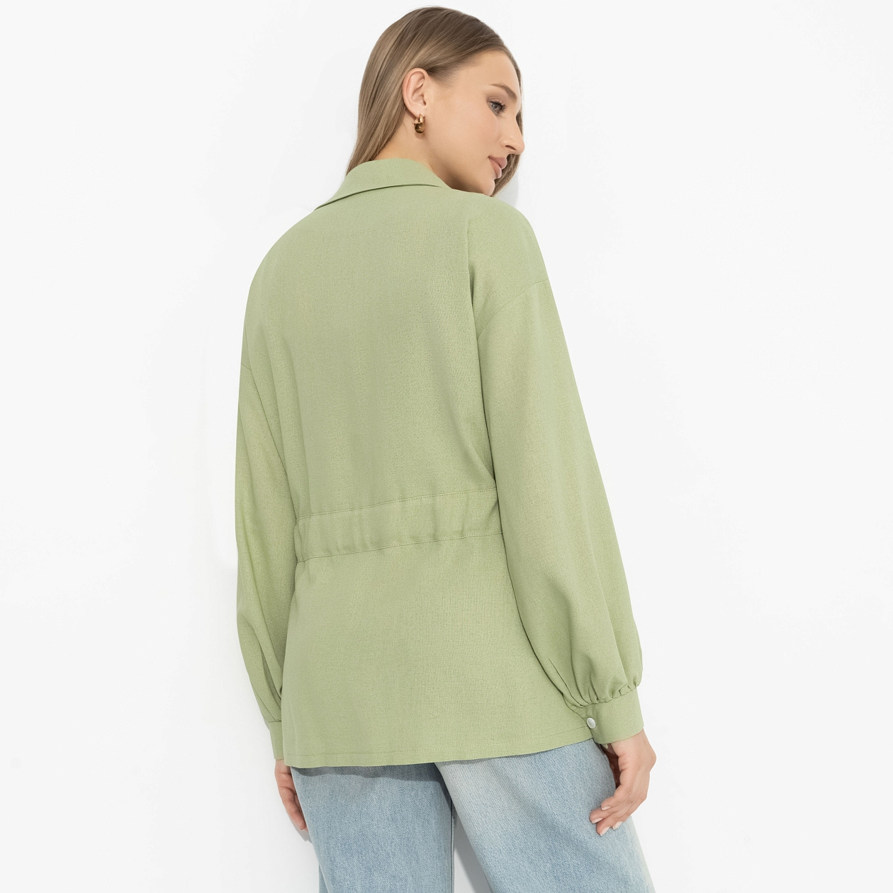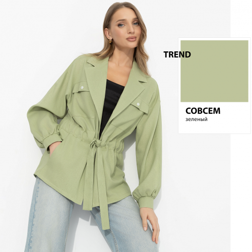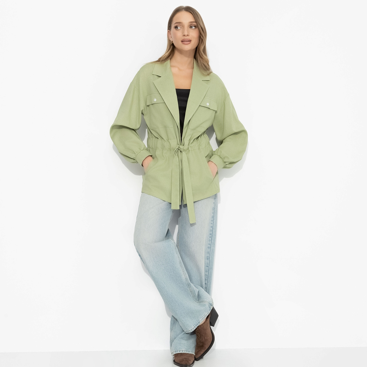 Почему одни оттенки «работают», а другие – нет? Ответ почти всегда в подтоне. Этот мягкий зелёный как раз из тех, что дружит с внешностью: особенно красиво раскрывается на «весне» и «мягкой осени», и кожа с тёплым или нейтральным подтоном начинает буквально светиться. Он не перебивает, а подчеркивает – делает лицо свежее, взгляд мягче. За счёт этого даже простой крой выглядит продуманно. Талия собирается кулиской, силуэт остаётся свободным, и весь акцент уходит в цвет – спокойный, но очень точный.