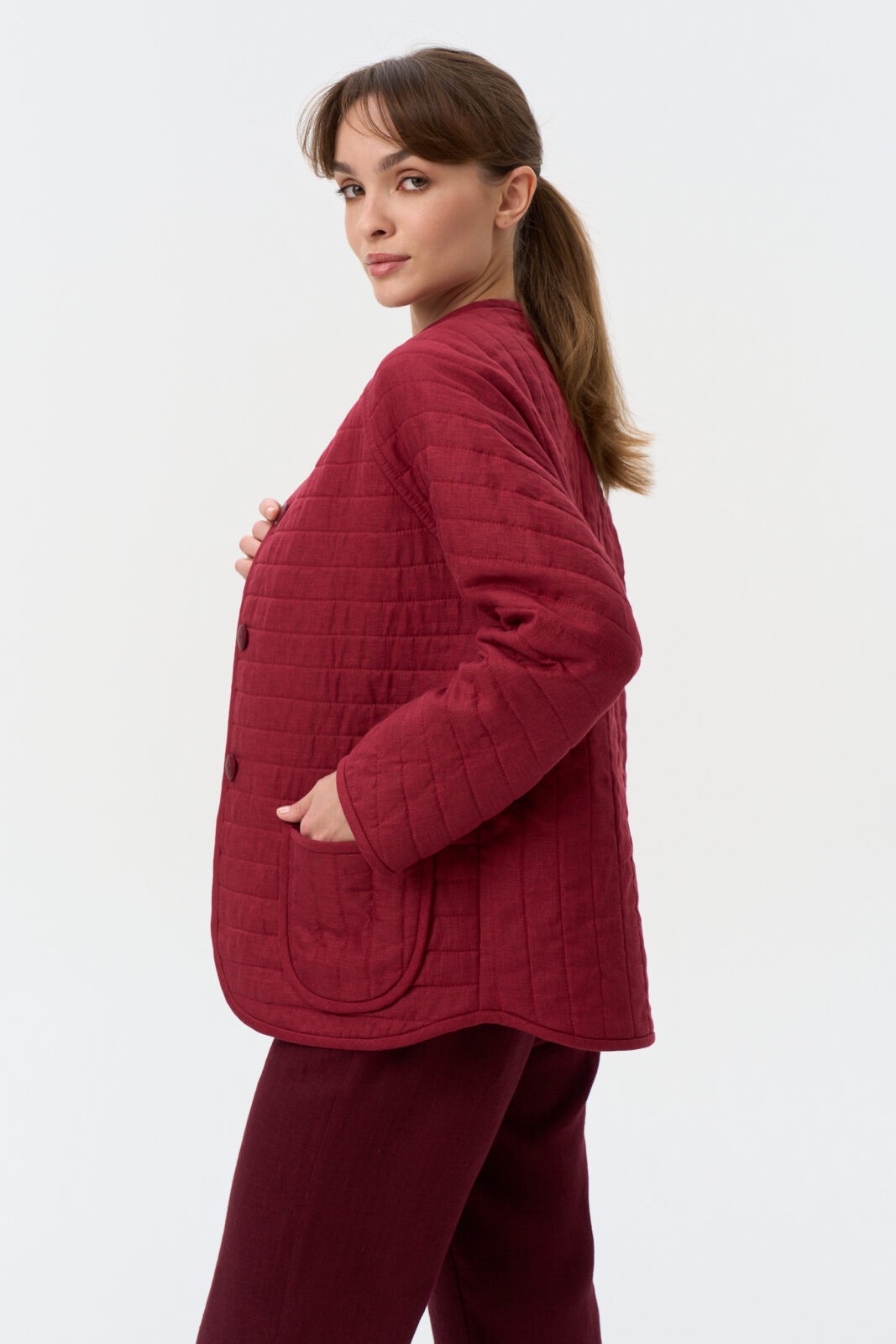 Жакет утепленный стеганный на футере среднего объема длиной до середины бедра. Спинка с цельнокроеным рукавом. Застежка центральная на пуговицы. Горловина округлой формы. Спереди накладные карманы.