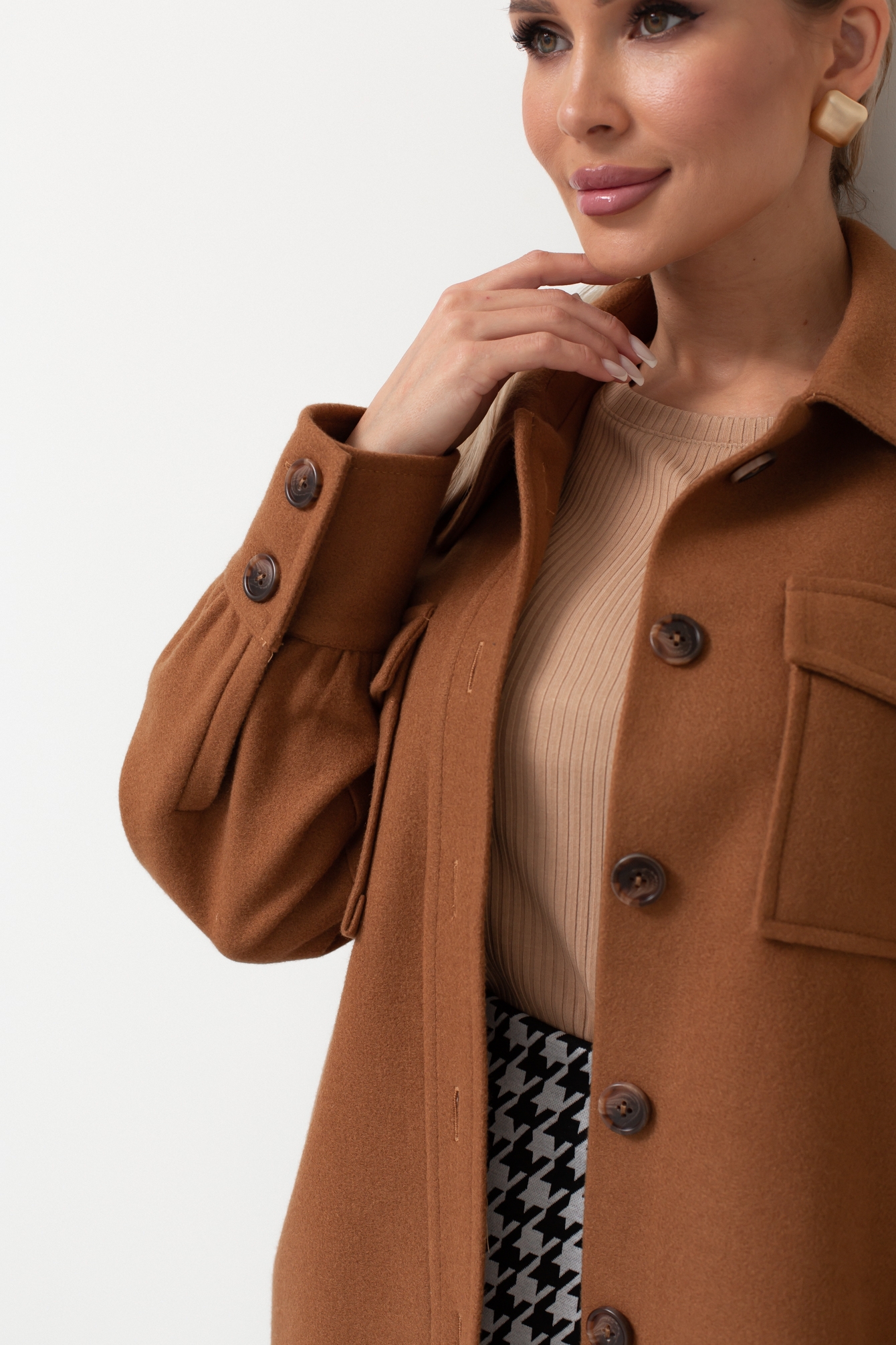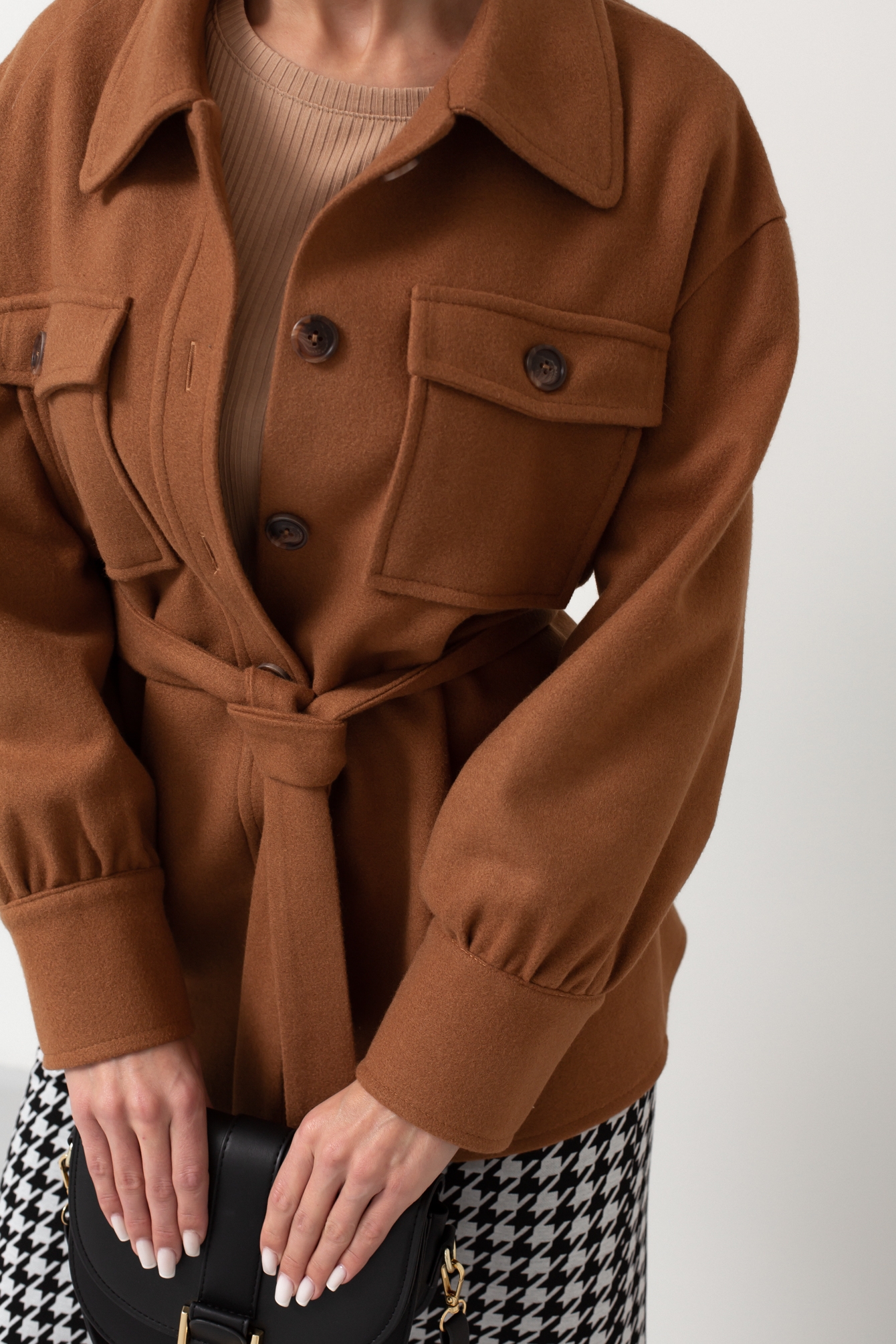 Стильный жакет из пальтовой ткани. Модель с накладными карманами на пуговицах. Горловина оформлена отложным воротником, переходящим в планку с застежкой на петли и пуговицы. Длинный втачной рукав со спущенным плечом, оканчивается притачной манжетой. Низ прямой, без разрезов. Пояс из основной ткани в комплекте.