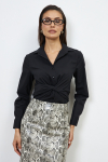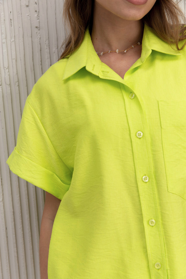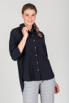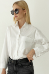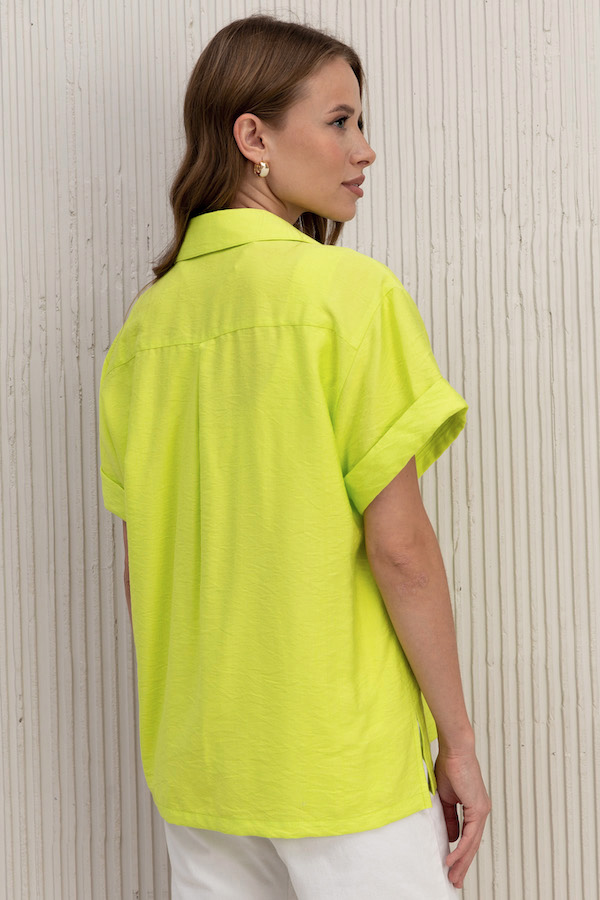 Рубашка из вискозной ткани с крэш-эффектом. Свободный силуэт с разрезами в боковых швах и застёжкой на планке. Вырез горловины обработан отложным воротником на стойке. Короткий рубашечный рукав с отворотом. На задней части изделия выполнена кокетка с небольшой складкой. На передней-накладной карман в области груди.