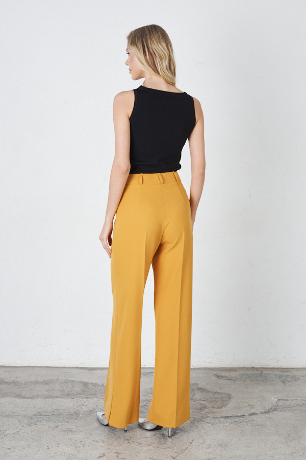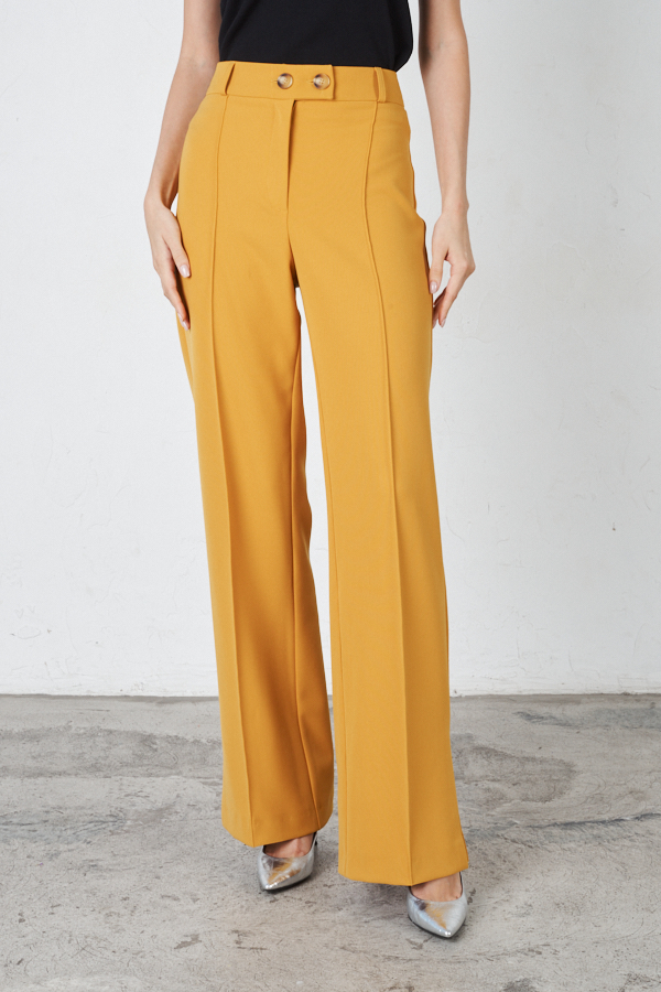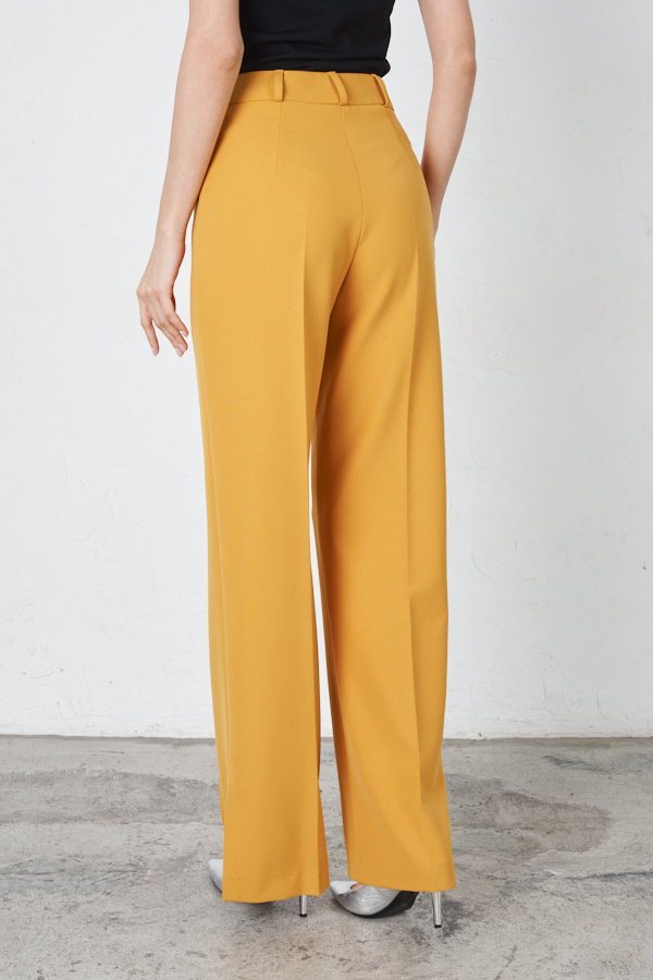 Брюки прямого силуэта, с разрезами в боковых швах из костюмной ткани. На передней части брюк застрочены стрелки. Притачной пояс со шлёвками. Застёжка на молнию-гульфик и пуговицу. Секрет такой модели кроется в безупречно точной посадке по талии и бедрам – ничего лишнего, только конструктивные детали, которые придают четкость линиям силуэта.