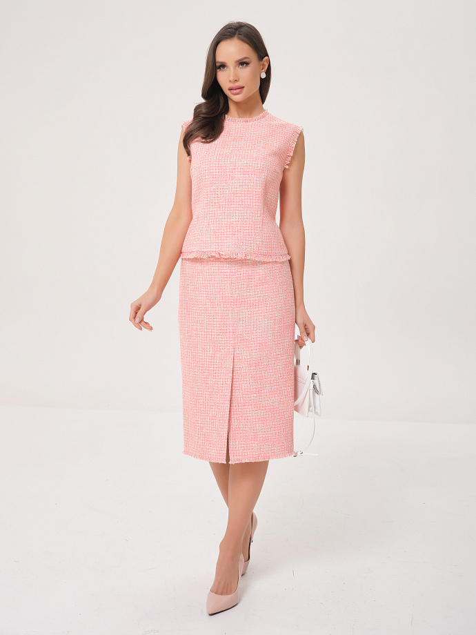 Модель прилегающего силуэта, на подкладе. В среднем шве спинки обработана потайная застёжка молния. Горловина округлой формы. Блузка декорирована бахромой...