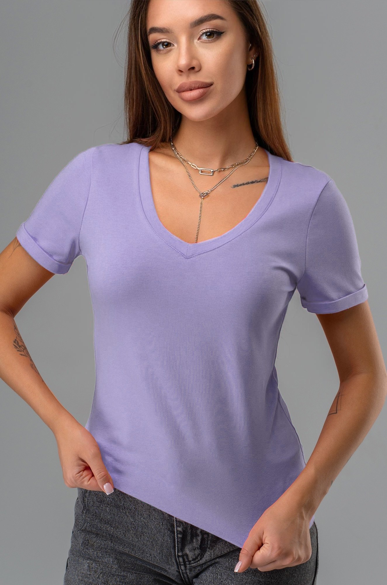 Элегантная база для идеального образа на каждый день! Сиреневая женская футболка с V-образным вырезом подчеркнёт область декольте. Полуприталенный крой создает утончённый и женственный силуэт. На рукаве небольшой отворот – маленькая деталь, дополняющая образ.