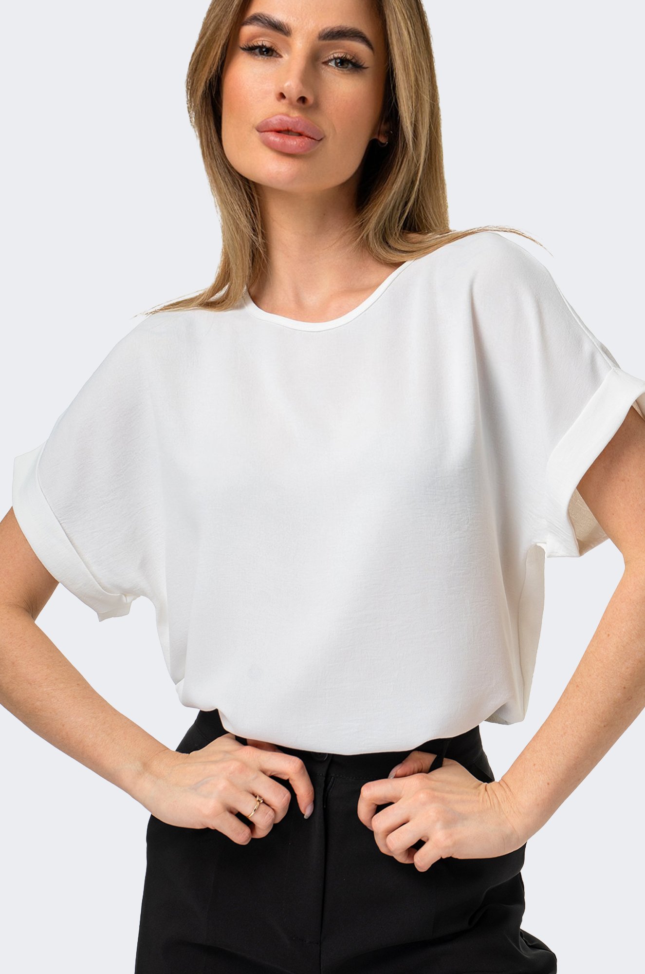 Нежная блузка из невесомой ткани жатка, подчёркивающая вашу естественную красоту, – то, что нужно для прогулок с друзьями или светских выходов. Короткий цельнокроеный рукав с отворотом, удлиненная спинка и разрезы по бокам добавят лёгкости и изящности!