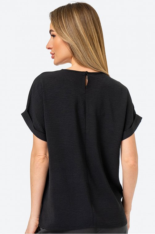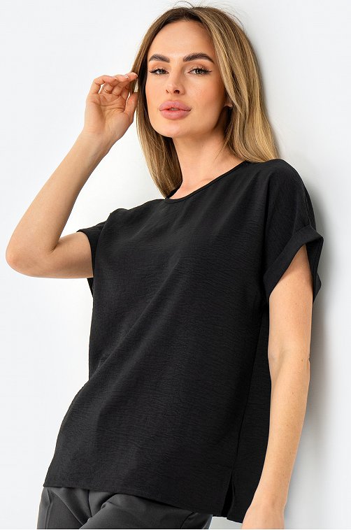 Забудьте про глажку! Модель выполнена из ткани, которая не мнется. Благодаря своим свойствам черная блуза красиво драпируется на теле, создавая воздушные складки и небрежные линии.
